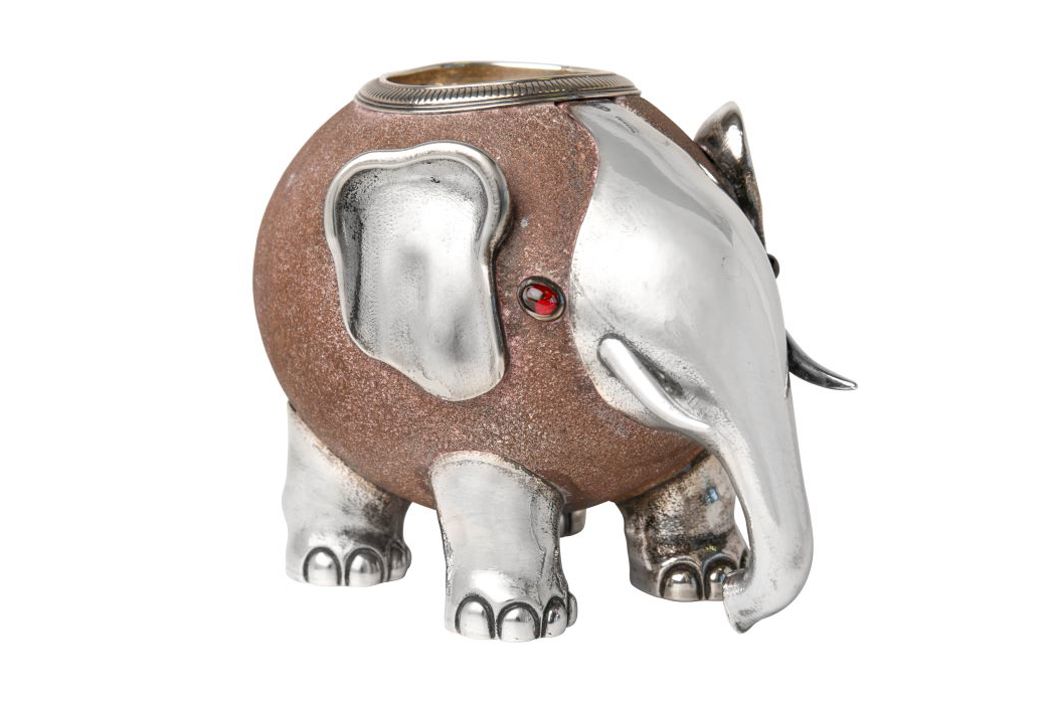 Humorously modelled silver-mounted sandstone match holders in the form of animals, such as the present example were made in various forms. Perhaps the closest to the present elephant was one previously in the collection of His Royal Highness the Prince Henry, Duke of Gloucester, and which was sold by Christie’s 25 November 2013 as lot 225. Another example, formed as a rhinoceros was sold by Bonhams (26 November 2014, lot 156) and one formed as a pig was sold by Sotheby’s (12 June 2008, lot 653).