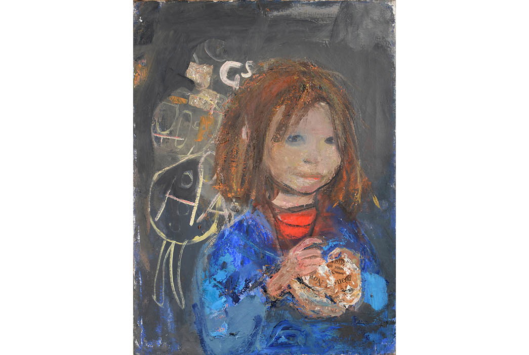 Paintings and drawings of Glasgow’s street children spanned her career, right up until her premature death at the age of 42. Eardley was one of a generation of artists to whom urban childhood was a source of fascination – but the naturalistic poses of her sitters, their confident and direct gazes and the warmth of portrayal, point to the comfortable relationship she had with these children. In ‘Girl with a Poke of Chips’, against a grey, graffiti-strewn background, our sitter wears a vivid Giottesque blue contrasted with red; momentarily her attention has been drawn from her chips to look at us. Thepainting was included in the 1975 Scottish Arts Council Exhibition, before being exhibited with Roland, Browse & Delbanco, London, where it was purchased in 1963.