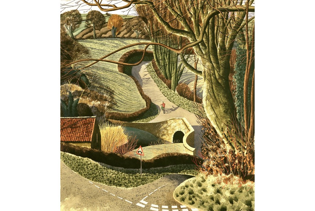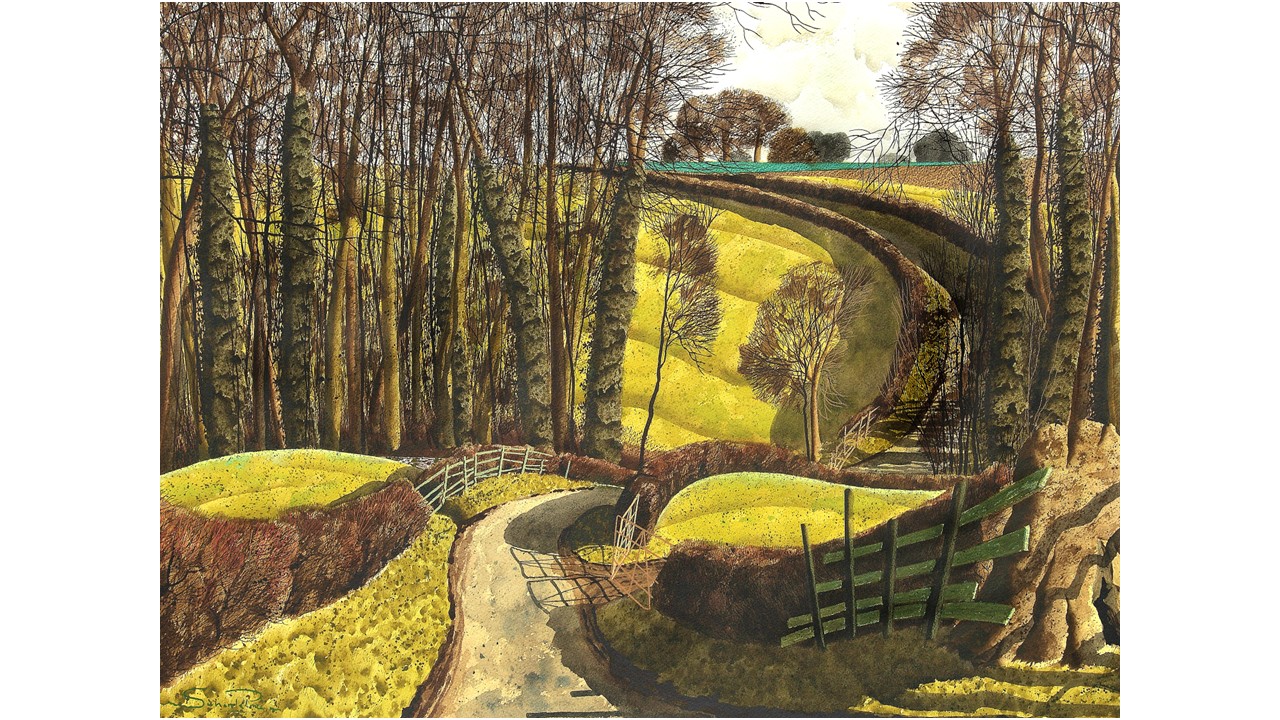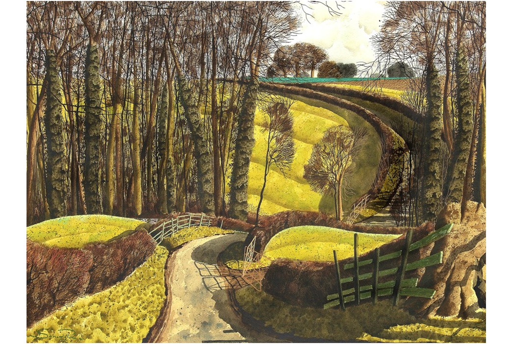 Simon creates his watercolours in his studio, working from quick sketches executed en plein air, which are then translated through his memory. Rather than observing the landscape impassively from a high viewpoint, Simon’s pictures put the viewer into the rural, agricultural landscape richly layered with both the natural and the man-made; winding lanes, verges, curving hedges and linear fences, trees wreathed with ivy and billowing foliage, signposts and barns, railway bridges and rolling fields. This set of prints is an artist’s highly personal response to a much-loved landscape, but whilst the landscapes seem very familiar, Simon invites the viewer to look anew and observe more closely the world around us.