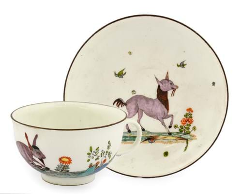 A Meissen Porcelain "Fabeltiere" Teacup and Saucer, circa 1740, painted in the manner of Adam Friedrich von Löwenfinck, each painted with a fantastical animal in landscape within brown line rims, crossed swords marks in underglaze blue. From the Collection of Mrs Hoff of Hoff Antiques, Kensington High Street, London