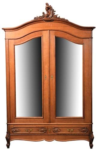 double-door mirrored armoire with canopy top, the base with two drawers above a shaped apron and on cabriole forelegs, 149cm by 58cm by 245cm