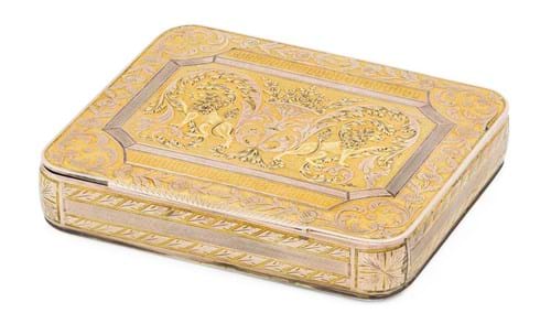 shaped oblong, the hinged cover decorated with two lions rampant among foliage and with a vase of flowers