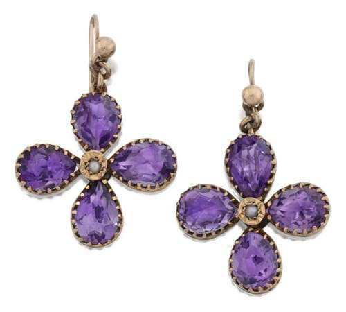 A Pair of Split Pearl and Amethyst Drop Earrings