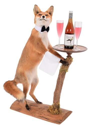Taxidermy: An Anthropomorphic Red Fox Waiter (Vulpes vulpes), modern, a full mount adult fox in upright position, partly dressed as a restaurant waiter, the raised front legs with folded towel and dickie bow tie around the neck, supporting a circular tray with wine bottle and glasses, mounted upon a split log base, overall height 94cm