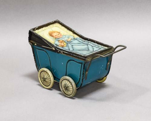 Huntley & Palmers Biscuit Tin Pram with lift off lid depicting a child and teddy 8", 21cm long (G, some loss to lithography mainly to edges)