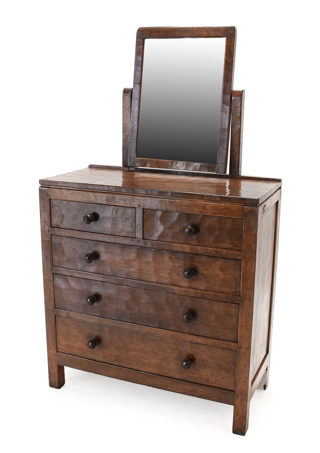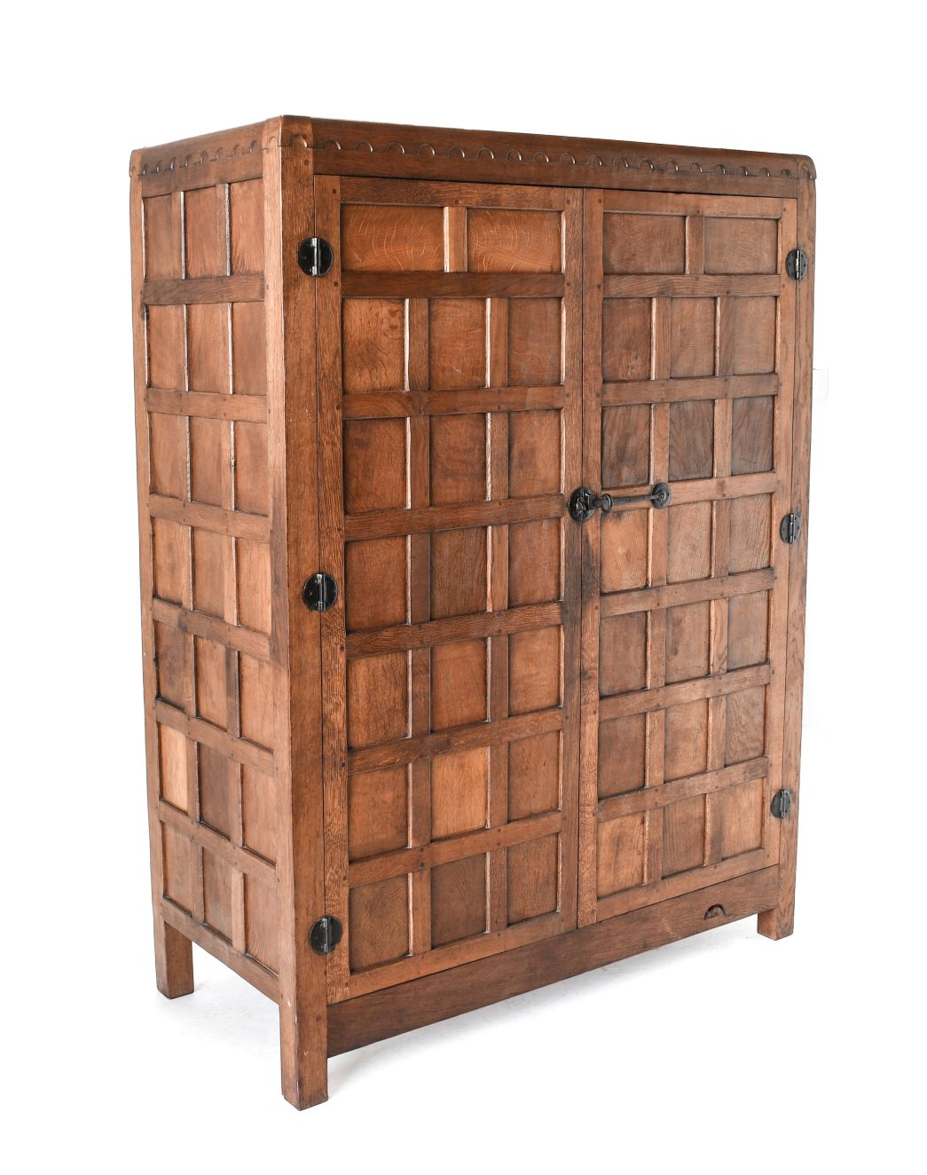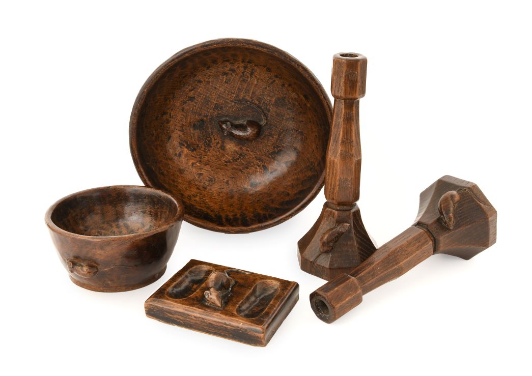 Another strong offering of Mouseman furniture and furnishings, amounting to over one hundred lots, includes fine, sought-after pieces made during the lifetime of Robert ‘Mouseman’ Thompson. Highlights include a Panelled Double Wardrobe (estimate: £5,000-7,000), a circa 1930s/40s Panelled Dressing Chest and Mirror (estimate: £4,000-6,000), and a family collection of highly collectable small pieces with deep patination all made by Mouseman craftsman George Cave (1893-1969), to whom the vendor was related. Notable lots in the collection, which dates from the 1930s, include a Mantle Clock (estimate: £2,000-3,000), a Pair of Candlesticks (estimate: £1,000-1,500), a Bowl (£700-1,000), and a Double Pin Tray (£300-500). From other vendors come a Mouseman Carved Oak Pheasant (estimate: £3,000-4,000), a Stan ‘Woodpecker’ Dodds Carved Oak Owl, with provenance from the carver’s estate (estimate: £2,000-3,000), and a John ‘Grasshopperman’ Minikin Carved Oak Owl made for Trevor ‘Squirrelman’ Hutchinson (estimate: £2,000-3,000). Arts and Craft furniture from the Lake District is represented by two lots by Stanley Webb Davis of Windermere; a Chestnut Mirror is offered with an estimate of £200-300, and a Chestnut Hanging Corner Cupboard is offered with an estimate of £300-500.