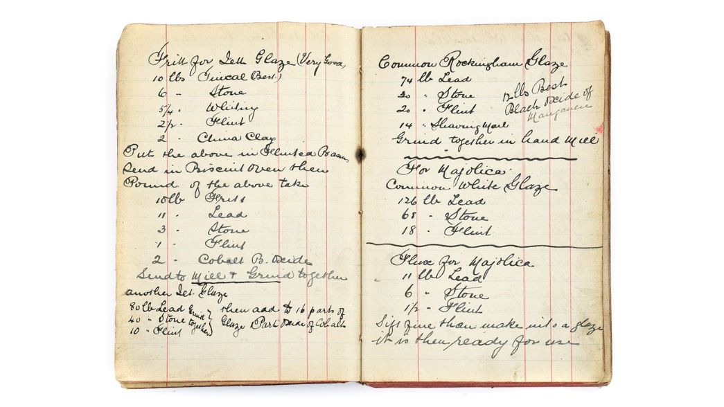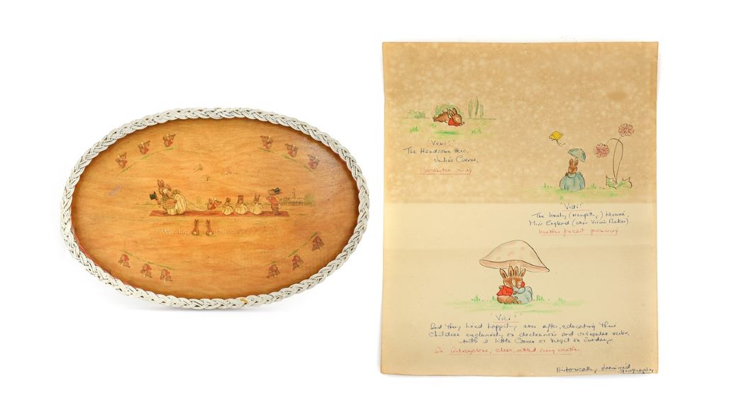 Amongst the more unusual lots in the sale is a notebook, which once belonged to John Beswick, owner of the Beswick Pottery. Dated April 1893 and signed by Beswick, the notebook contains handwritten recipes for colours, bodies and glazes, including Jet glaze, Common Rockingham glaze, and Bamboo brown glaze. The book, which is offered with an estimate of £250-350, and was given to the vendor by Beswick’s granddaughter Judith Mary Stonestreet (nee Beswick), who was married to the vicar of Askrigg, Wensleydale. Of interest to collectors of ceramics is a Bunnykins Oval Tray hand-painted to celebrate a wedding in 1958 by the Bunnykins creator Mary Barbara Bailey. The tray is accompanied by a document with three watercolour Bunnykins illustrations and inscriptions and a group of Royal Doulton Bunnykins Nursery Wares, the whole offered with an estimate of £200-300.