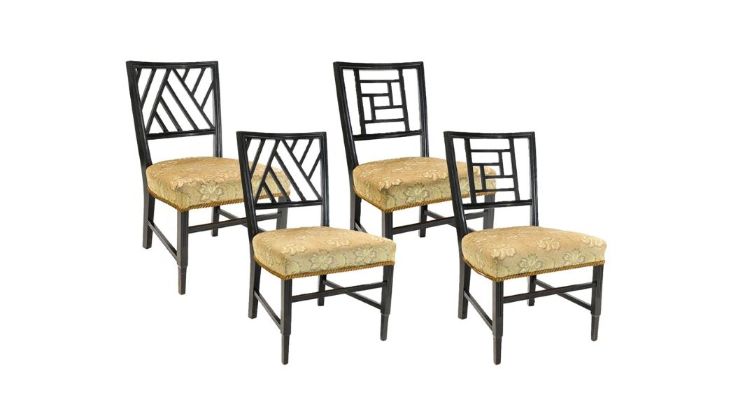 Four Anglo-Japanese Ebonised Beech Side Chairs designed by Edward William Godwin (1833-1886) and retailed by William Wyatt, are being sold individually, each with an estimate of £1,000-1,500. The chairs have two different patterns to the lattice backs, the design of which was included in Susan Soros’ monograph on the designer. Godwin was an architect-designer who was fundamental to introducing the Anglo-Japanese style, which would become central to the Aesthetic Movement.