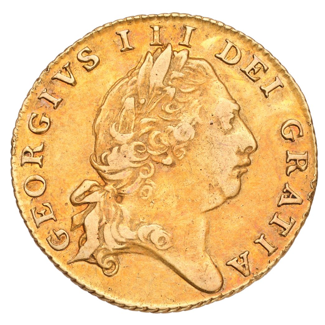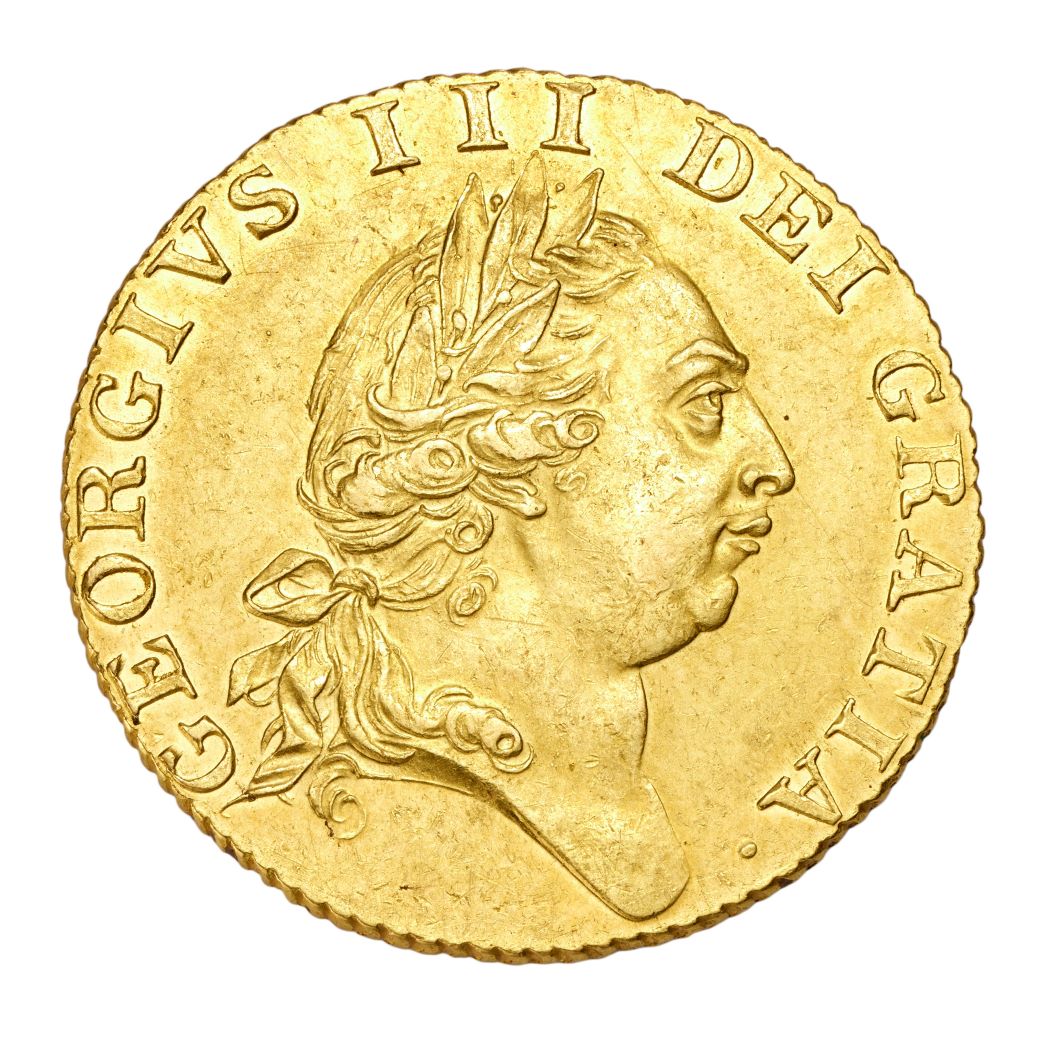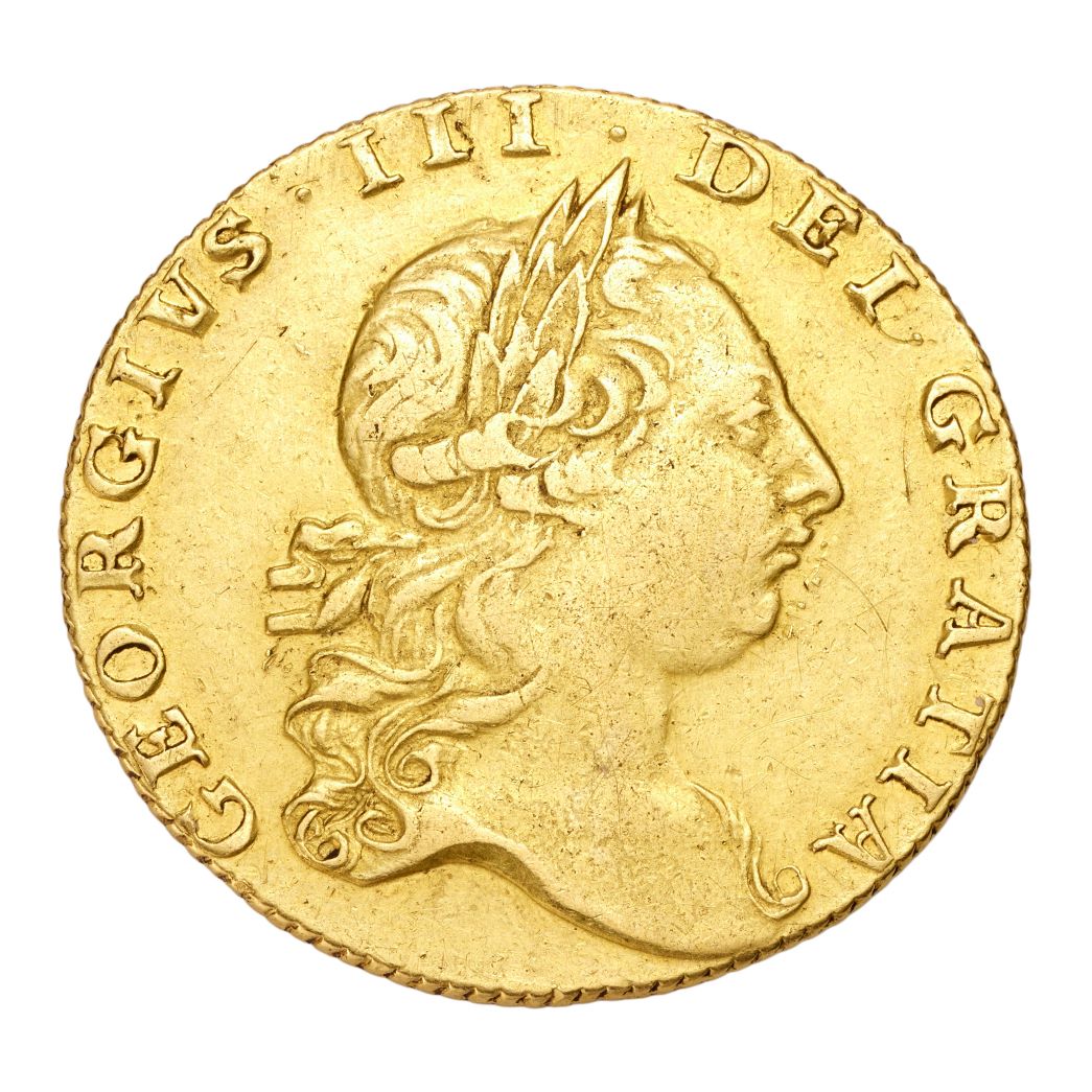 The Guinea traditional portrayed the monarchs head on the obverse and a version of the Royal Arms on the reverse. Most of the coins struck during the last years of issue (1787-1799) had a spade like representation of the Royal Arms and it became known as the ‘Spade Guinea’.