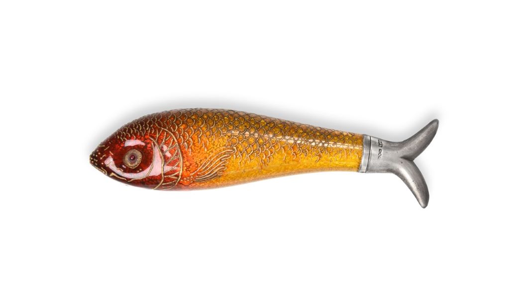 Perhaps the most eye-catching scent-bottles in the collection is a Victorian Silver-Mounted and Gilt-Heightened Coloured Glass Scent Bottle, in the form of a fish. The scales and gills are delineated in fine gold lines on vivid orange glass, and a detachable silver tail is marked for Horton and Allday of Birmingham, 1884 (estimate: £300-500). Another pretty piece is a French Silver-Gilt and Enamel Scent-Bottle, made in the second half of the 19th century and stamped with the French Control Mark of Small Articles. Pear-shaped and with coloured enamel foliage, flowers and strapwork, it is offered with an estimate of £120-180.
