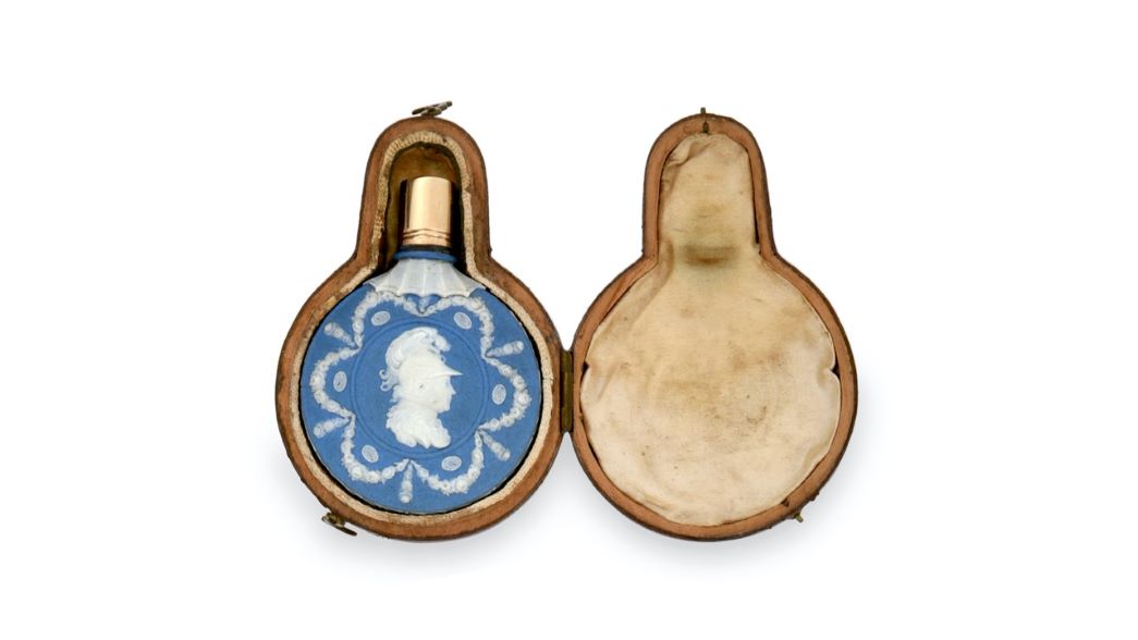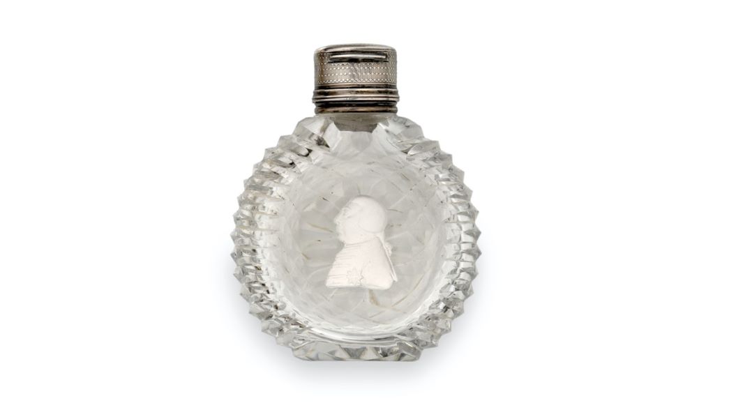 Featuring a portrait bust, probably Frederick, Duke of York wearing a military uniform adorns a George III or George IV Silver-Mounted Sulfide Scent-Bottle likely made by Apsley Pellatt and Co. of London circa 1820 (estimate: £250-350). Frederick, Duke of York and Albany was the second son of George III and having been sent into the army at an early age rose to high command by the age of 30. He later served as Commander-in-Chief during the Napoleonic Wars and was responsible for the reorganisation of the British Army.