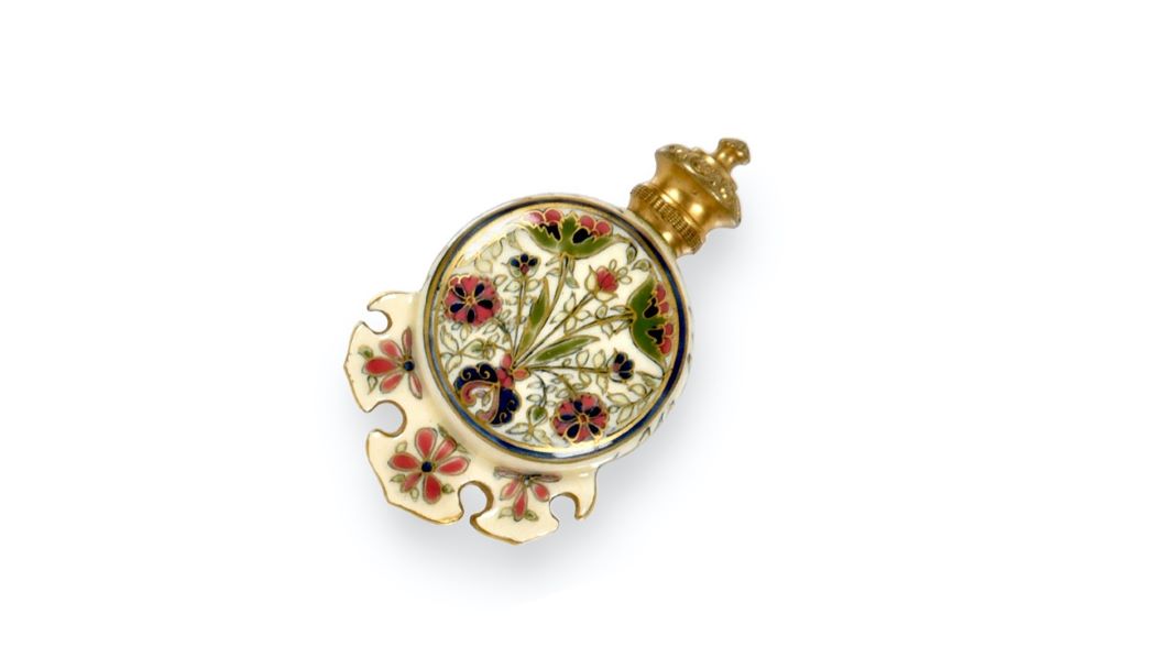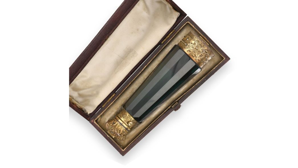 Highlights of the Collection include a charming example decorated in the Iznik style, made by Zsolnay circa 1880 (estimate: £80-120). Zsolnay were one of the most renowned makers of porcelain and stoneware in Hungary and made scent-bottles in the late 19th century, some designed by Armin Klien. A rare and interesting item is Victorian combined scent-bottle, vinaigrette, pin-cushion and photograph frame. Made from green glass with gilt-metal mounts, its design was registered in January 1872 by Akerman, Worrall and Phillips of London (estimate: £400-600).