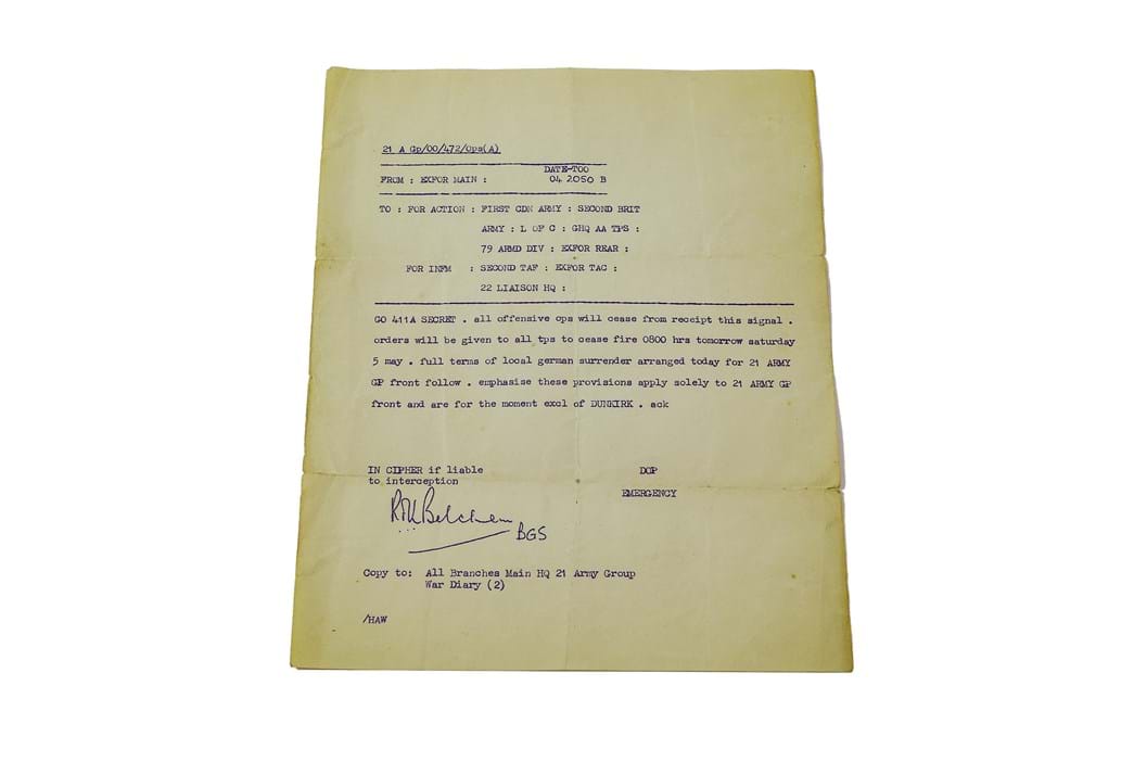 The order commands that 'all offensive ops will cease from receipt this signal . orders will be given to all tps to cease fire 0800 hrs tomorrow Saturday 5 May...'. The order is signed in facsimile by Major General R.F.K Belchem, head of Field Marshall Montgomery's operations staff at Luneburg Heath, and the reverse is written with instructions to the courier.