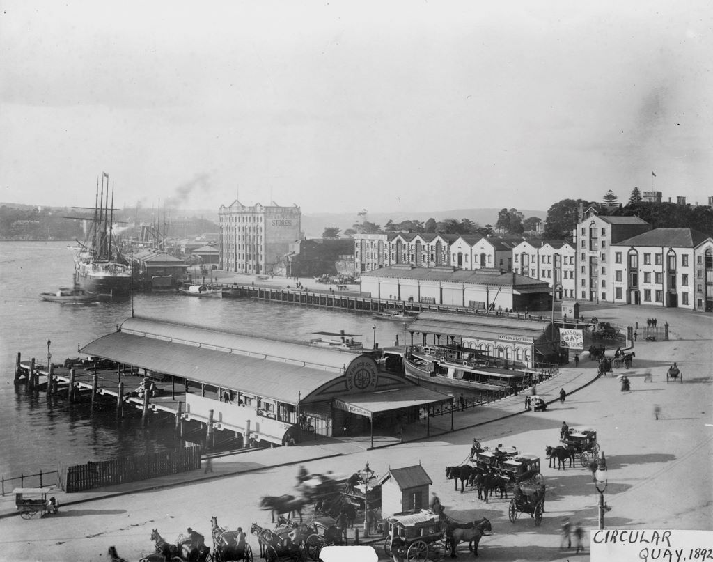 Sydney Cove was the site of the landing of the First Fleet in 1788 and was the point from which Sydney grew. The first wharfs were built in 1792, and Circular Quay (originally called Semi-Circular Quay) was constructed between 1837 and 1844 to become the central harbour and port for the city. By the 1860s all sides of the quay were lined with warehouses, largely devoted to the wool trade. As the city outgrew the cove, it was converted to a passenger ferry hub, and from the 1950s the stone warehouses were replaced with modernist buildings and the first skyscrapers in Sydney. AMP’s headquarters were built on the south shore in 1962, and at the time it was Sydney’s tallest building. Sydney Cove was crowned with the building of the Sydney Opera House on the northeast point in the early 1970s.