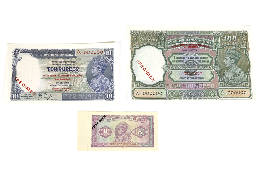 • Burma, a Set of 6 x Specimen Banknotes comprising 2 x provisional issue notes (1943) 4 annas & 8 annas (1943) MILITARY ADMINISTRATION OF BURMA, both stamped ‘SPECIMEN’ in black and 4 x notes with overprint: ‘MILITARY ADMINISTRATION OF BURMA: LEGAL TENDER IN BURMA ONLY’ on Reserve Bank of India Notes & comprising: 1 rupee (1945) on ‘Government of India’ note, red overprint; 5 rupees (1945) dark blue overprint, 10 rupees (1945) red overprint & 100 rupees (1945) red overprint (5, 10, & 100 rupees signed J B Taylor); all stamped ‘SPECIMEN’ in red, all 000 000000 & all in mint state, a very rare set