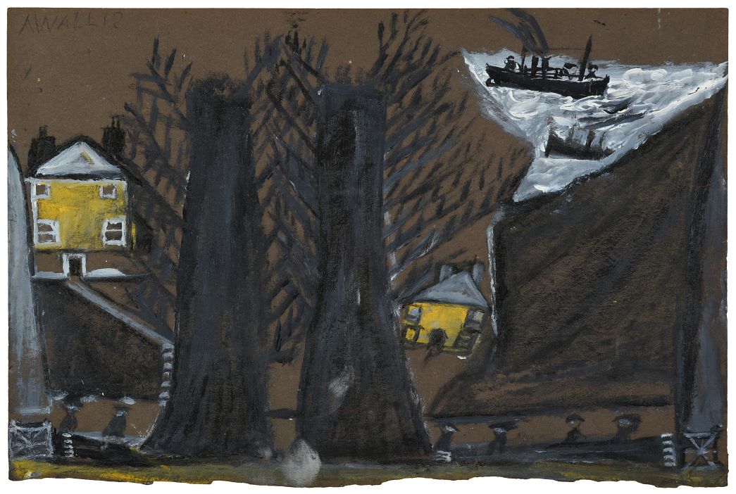 When his wife died in 1922, Wallis took up painting ‘for company’, never seeking any form of artistic training. Using a limited palette of marine paint and any scraps of cardboard, packing box or wood he could get hold of, he developed his own unique style, depicting what he knew best – port landscapes and shipping. His instinctive, naïve approach saw formal perspective abandoned, and scale was often based on an object’s importance in a scene. Everything he drew came from his memories, largely from his formative years before sail gave way to steam. Indeed, he is recorded as saying he painted “What use To Bee out of my memory what we may never see again”.