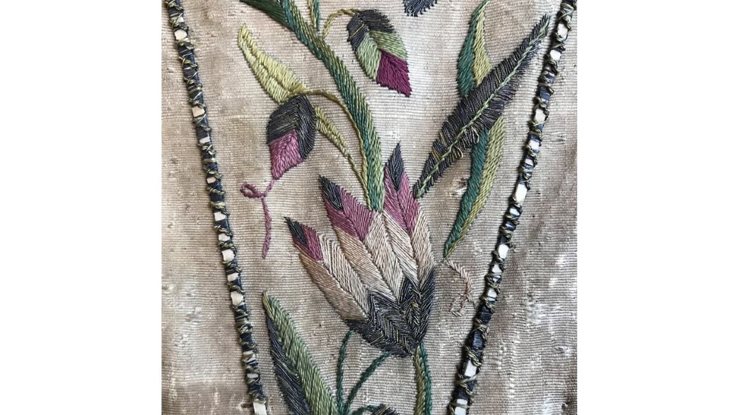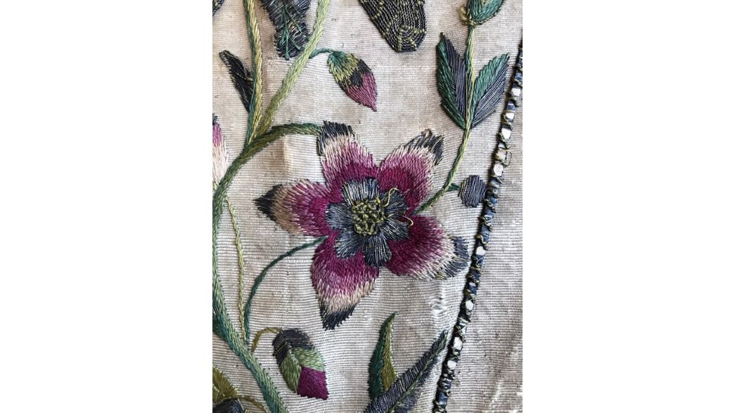 The exquisite style and quality of the hand embroidery on this piece is beautiful. It incorporates several basic stitches such as French knots, couching, satin and stem stitches. Using coloured silk and silver thread (which back then was produced by drawing out silver wire very finely, flattening it and then wrapping it around a silk core[4]) they have achieved an ombre effect for the petals of the flowers which was a very popular embroidery style during this period. The embroidery is still in great condition with the age only being shown by the silver thread that has worn in some areas exposing the silk core of the thread or lost its shine.
