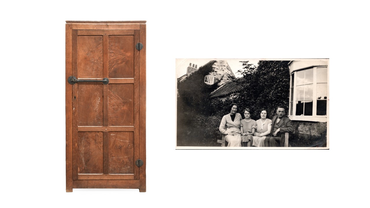 From a further Private Collection is an elaborately carved English Oak Blanket Chest, made in 1928 for John and Kathleen Brunton to celebrate their marriage, which took place in Halifax (estimate: £4,000-6,000). The chest is decorated with two Medieval-style carved heads in profile, and the initials ‘JKB’ along with the date ‘1928’. The chest is based on a 16th century example held in the collection of the V&A, and which was illustrated in Robert Thompson’s copy of Early English Furniture and Woodwork, a 1922 publication by Crescinsky and Gribble. Robert annotated the page next to the illustration with notes and working drawings, and the book is still in the possession of the Thomson family at Kilburn.