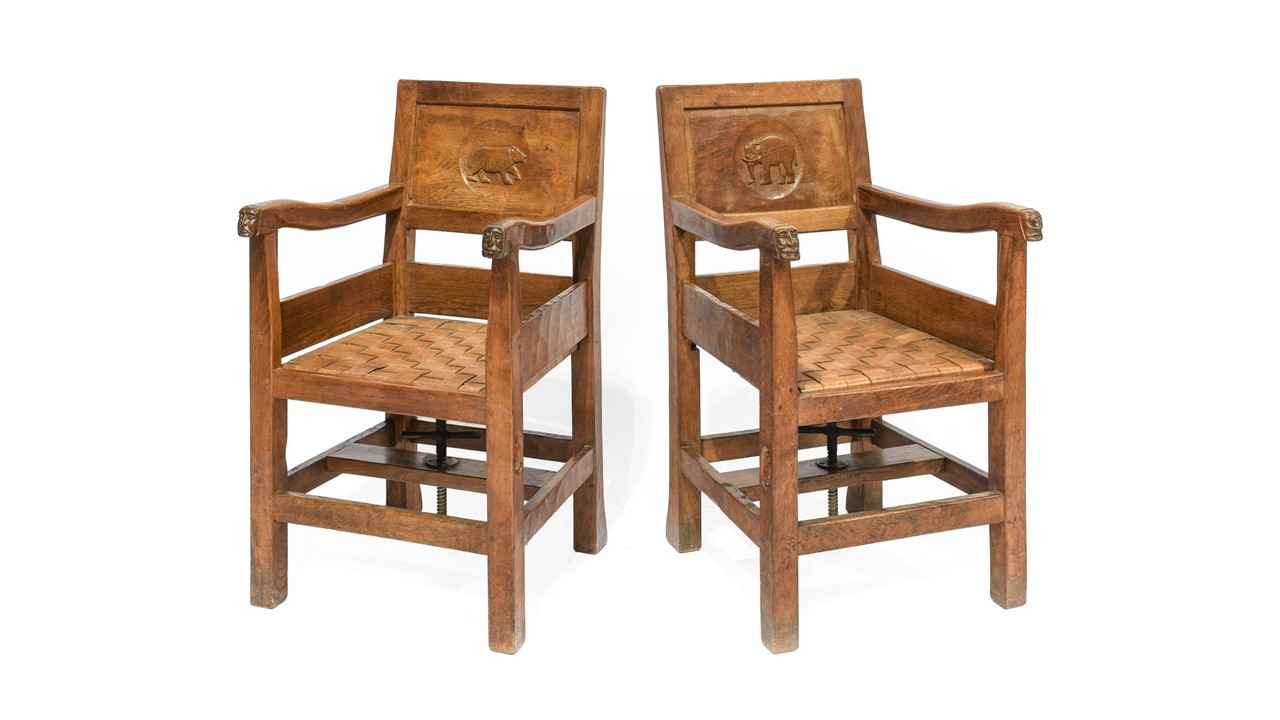 A set of unique child’s nursery furniture is also on offer, which was commissioned by the Thompson-Schwab family of Kingfield House, Penton, Carlisle before later being purchased by the current vendor. The unusual set comprises an English Oak 3’2” Single Bedstead, with the headboard carved with a scene from Beatrix Potter’s Peter Rabbit of Mrs Rabbit with three of the Flopsy Bunnies (estimate: £500-800), and a pair of English Oak Adjustable Chairs, the backs carved with a bear and an elephant (estimate: £3,000-5,000). The eminently practical chairs have a winding mechanism to the base allowing the height of the seat to be adjusted to match a child’s growth.