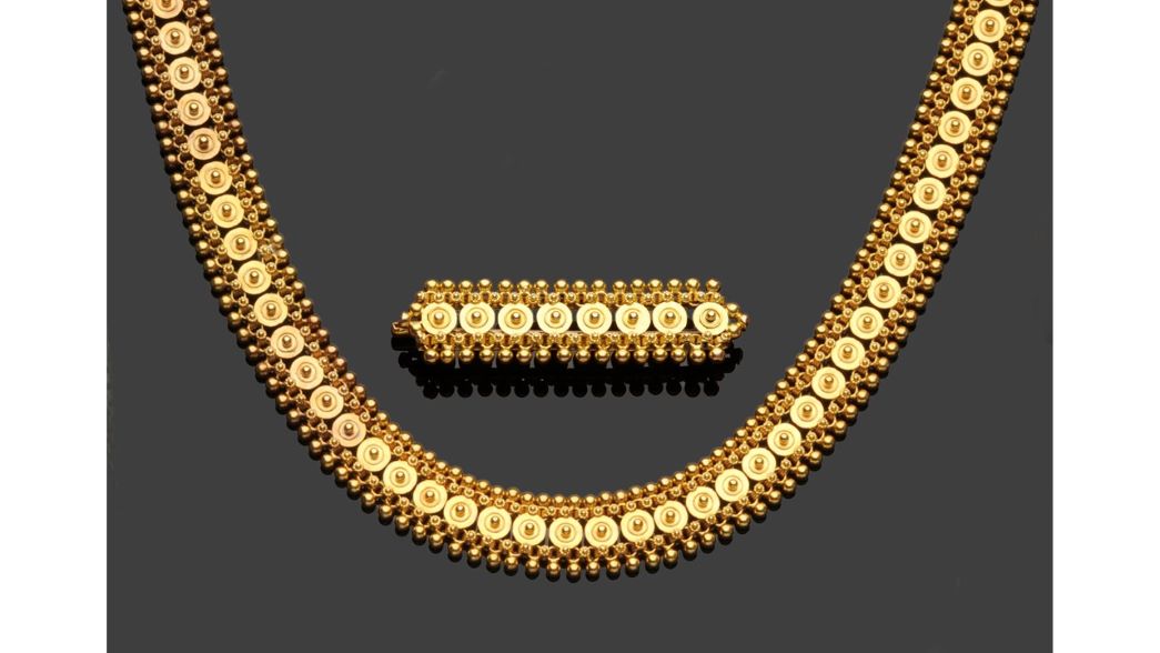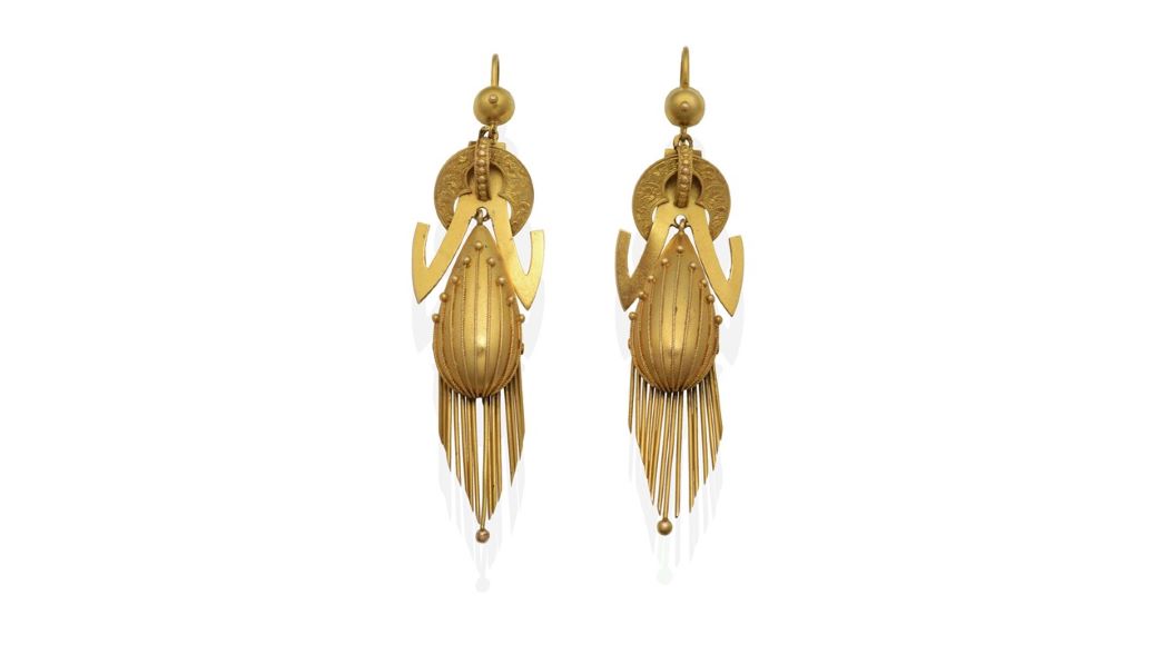 Antique or Archaeological Revival jewellery was enormously popular in the 19th century and remains a firm favourite at auction today. First emerging in Italy c.1815, it sought to recreate the styles and goldsmithing techniques from the past and simultaneously created a new fashion trend. Taking inspiration from the Etruscans, Romans, Greeks and the Byzantine Empire, finely wrought gold jewellery in simple geometric designs were embellished with textured surface patterns, fine micro-mosaics, gemstones, cameos, scarabs and enamels.