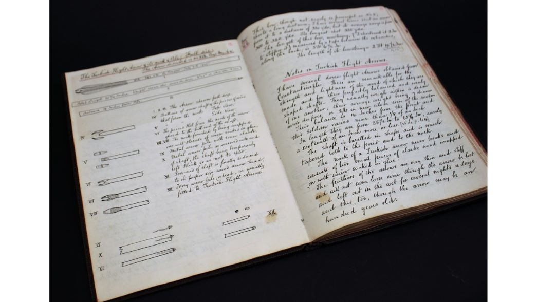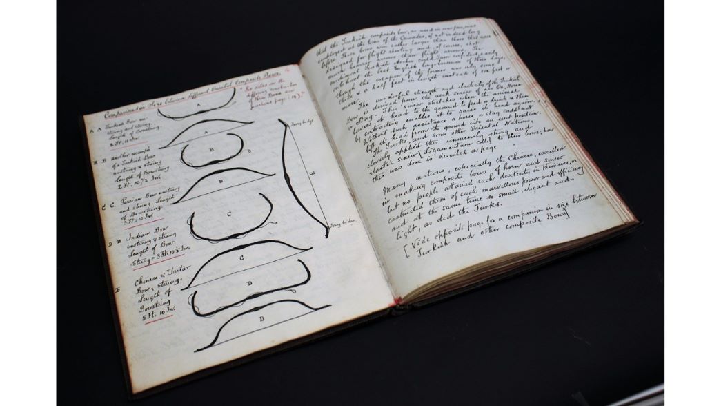 Sir Ralph Payne Gallwey (1848-1916), it appears, was a man with an extraordinary fascination for archery. Written in the first decade of the 20th century, the beautifully compiled manuscript tells of his research into Turkish and Chinese archery, a wide variety of bows and arrows, and methods of shooting. Payne Gallwey’s research was practical, and tables of flight distances, detailed illustrations and photographs of bows in use accompany meticulous hand-written notes. The manuscript also includes photographs of the extraordinary collection of weapons housed at Thirkleby Park.