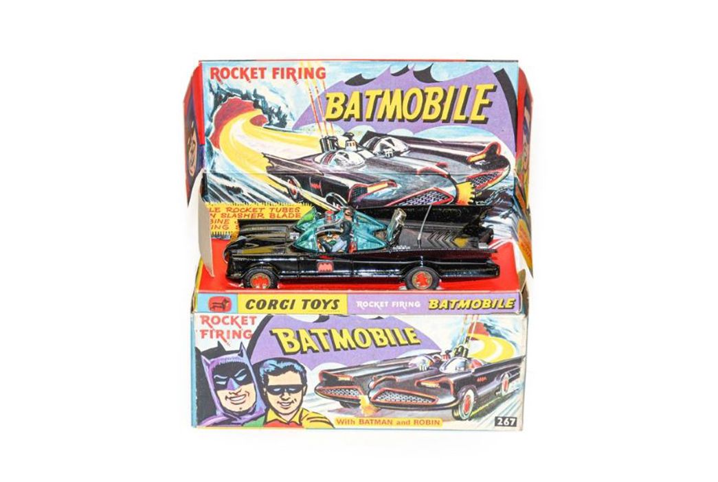 Corgi were the front-runners in producing film and television tie-in toys, their heyday being 1965-1968 when they produced their most popular models such as Batman Batmobiles, James Bond’s Aston Martin and Toyota 2000GT, The Beatles Yellow Submarine and models associated with The Saint and The Green Hornet. Dinky secured the rights to produce models from Gerry Anderson’s series including Thunderbirds and Captain Scarlet. The most sought-after models at auction, for which collectors pay a premium, are those in fantastic condition in their original boxes. The delicate cardboard boxes and display packaging was often discarded or badly damaged and indeed those boxes in the best condition are sometimes worth more than the toy themselves. Look out for toys that have all their original accessories, from accompanying figures to missiles, guns and even badges. Prices range from £10’s for playworn unboxed examples to the mid hundreds for those in the most exceptional condition.