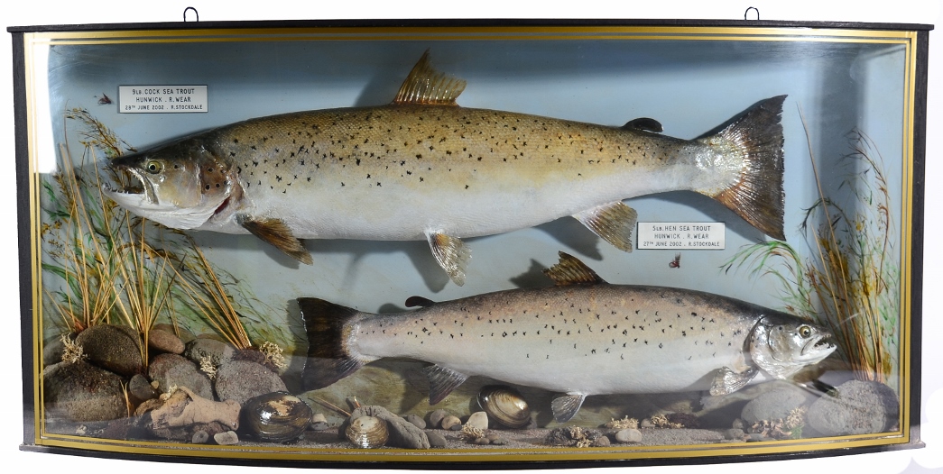 The beautifully mounted specimens comprise Salmon, Brown Trout, Sea Trout, Perch and Grayling, and are annotated with location of catch. The fish were caught on well-regarded fishing rivers such as the Deveron in East Lothian and the Annan in Dumfriesshire as well as North East rivers such as the Tees, Wear and Swale. Highlights include A Pair of Cased Sea Trout (Estimate: £300-400); the 9lb cock sea trout was caught at Hunwick on the River Wear on 28th June 2002, and the 5lb hen was caught in the same location the day before.