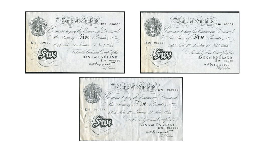 The sale will also offer collectors of banknotes the rare opportunity to own two consecutively numbered Bank of England white five pounds. Both are signed Peppiatt and dated 29th November 1944 with sequential numbers E76 050550 and E76 050551. With only minor discolouration to the left field the notes are truly about uncirculated. They are to be sold together with a third note numbered E76 050553 in a good very fine condition. The three-note lot will be offered with an estimate of £300-500.