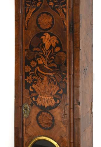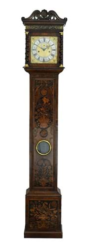 Marquetry longcase clocks flourished between the years 1680-1710, a period known as the ‘Golden Age of Clockmaking’. The era saw technical innovation and the finest craftsmanship combine to produce some of the best clocks known to this day, often elaborately decorated with marquetry composed of exotic contrasting woods on oak carcasses.