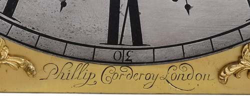 A Good Walnut and Marquetry Month Going Longcase Clock, signed Phillip Corderoy, London, circa 1690, case with a later carved pediment, barley twisted columns, glass side panels, trunk dial with D-ended panels with bird and floral marquetry inlay, base with matching inlay, 10-inch square brass dial with a silvered Roman numeral chapter ring, dial plate signed Phillip Corderoy, London, finely matted dial centre with date aperture and seconds dial, finely cast winged cherub spandrels and floral engraved outer borders, six pillar movement, latched pillars, anchor escapement and outside countwheel striking on a bell