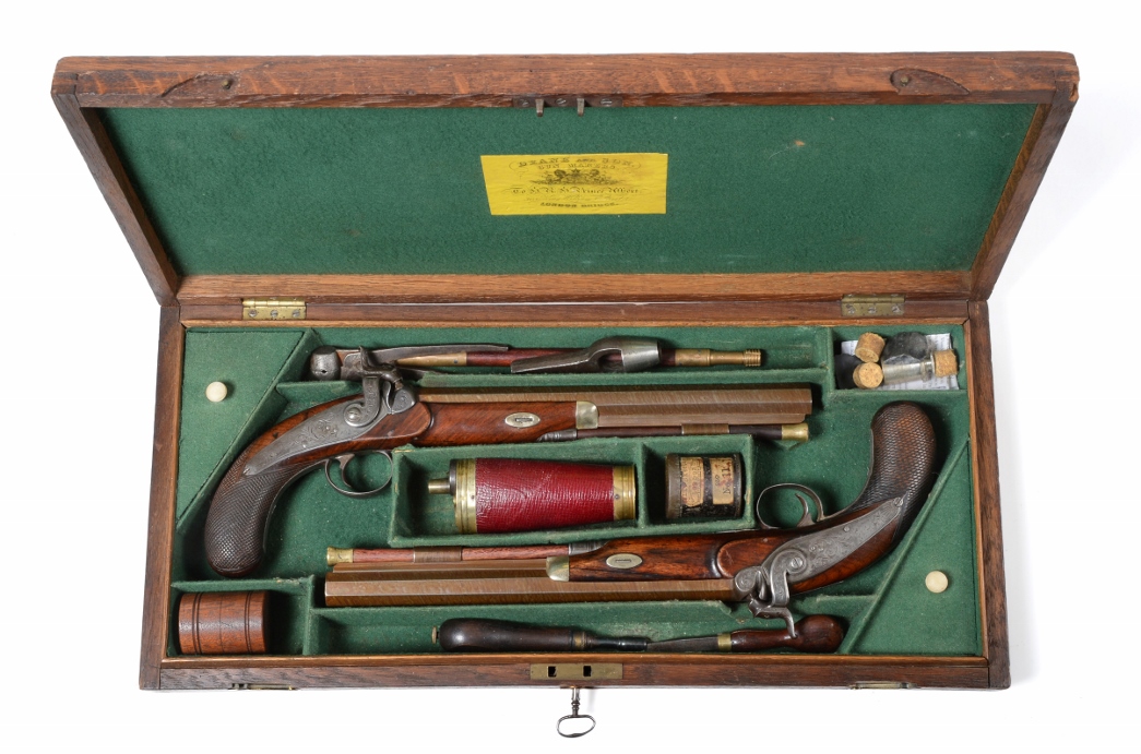 A good pair of 19th Century percussion target/duelling pistols by Strowse of Brompton (Kent) were the top lot in the Militaria and Ethnographica Sale at Tennants on 8th March. With octagonal twist-steel barrels and foliate engraving to the breech, tang and hammer, this good pair sold for £3,200 (plus buyer’s premium). A further pair of 19th Century percussion duelling/officer’s pistols also sold well. Made by William Chance and Son, the pair sold for £2,200 plus buyer’s premium.