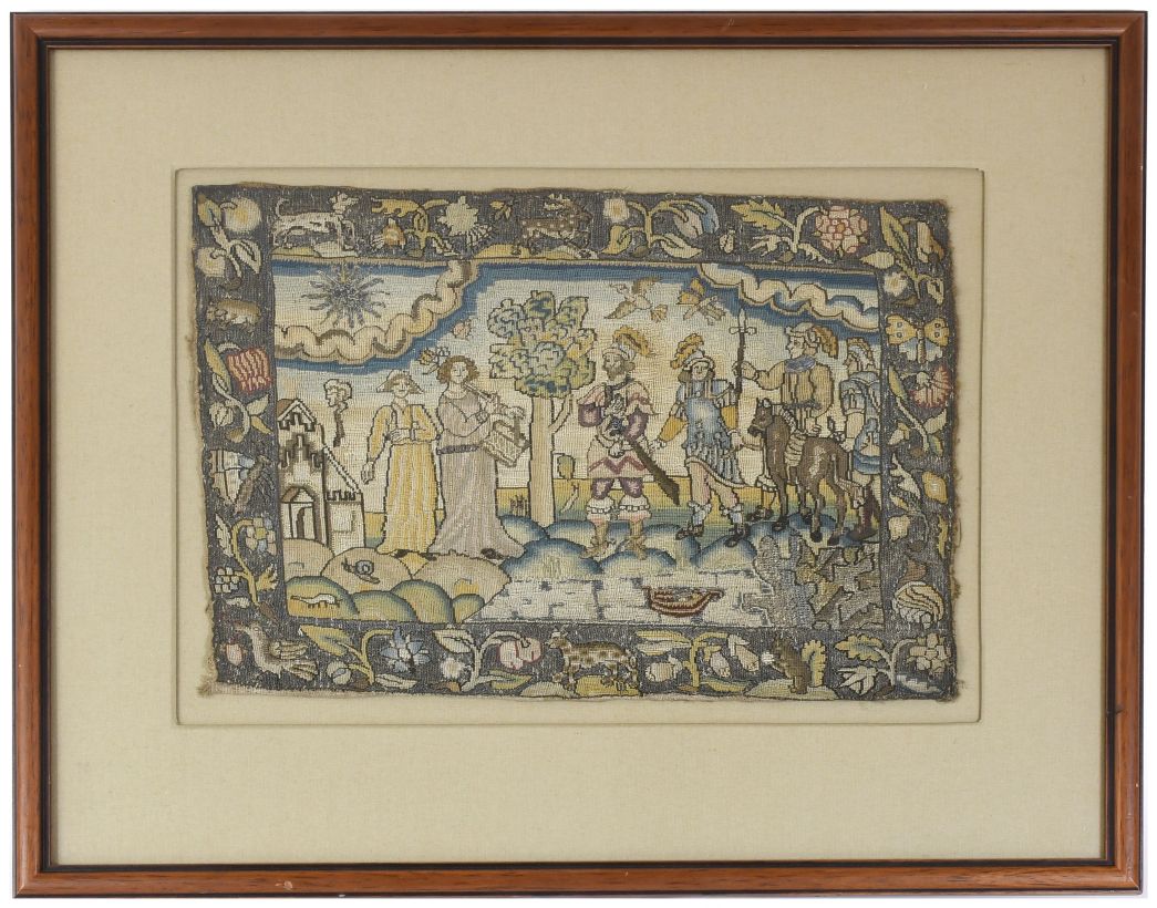 Good early needlework panels led the Fashion, Costume and Textiles Sale at Tennants Auctioneers on 21st November. Consigned from a private collection, a Late Elizabethan or Early Jacobean Needlework sold for £3,200 (all figures exclude buyer’s premium). Wrought in silks and silvered threads over a cream silk ground, the fine needlework depicted a stylised formal garden viewed from above, with trees, pillars and flowers all bordered with decorative strawberry plants. Selling well, too, was a Circa 1740 Needlework depicting a fashionably dressed lady in a red dress, which sold for £650. A Circa 1650 Needlework Picture depicting Abigail offering food to David from a second vendor sold for £800.