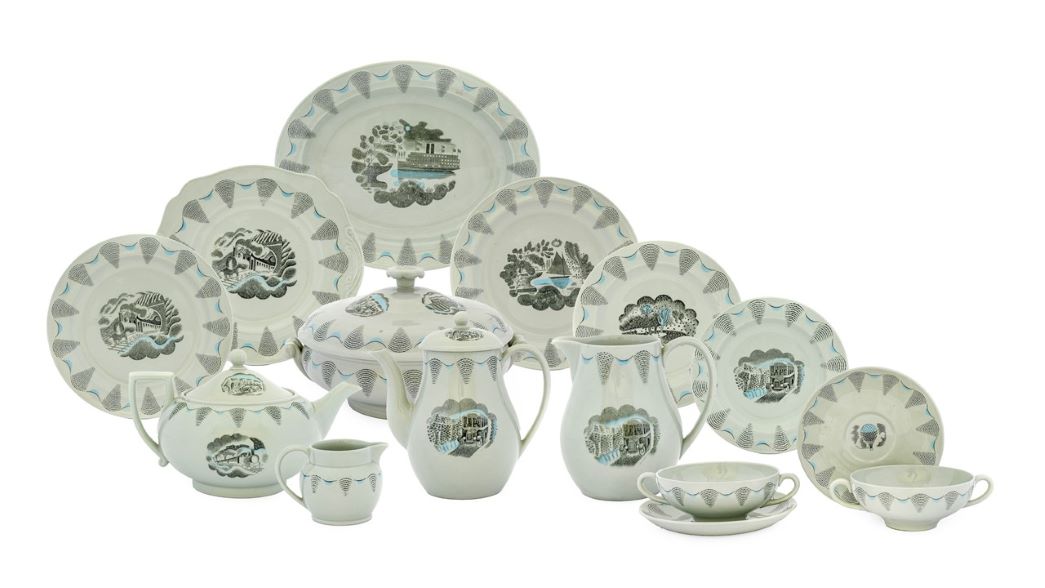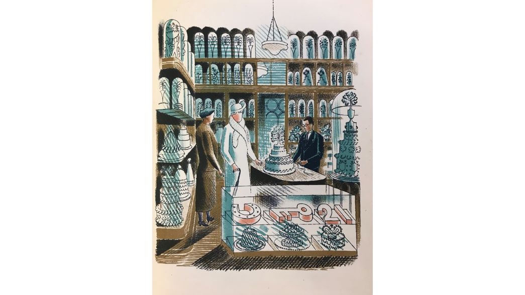 Today, at auction, Ravilious’ watercolours command prices into the high tens of thousands of pounds. Having died at a young age, fewer than 300 watercolours are thought to exist. However, there is a thriving market for his lithographs and ceramic designs, examples of which are much more affordable. Some of the most well-known images produced by Ravilious are a set of lithographs made to illustrate J.M. Richards’ book ‘High Street’. The book describes all the types of shop found on the English high street, from family butchers and cheesemongers to clerical outfitters and submarine engineers, which Ravilious perfectly and so charmingly represents in his illustrations. One of the most collectable artist’s books of the period, only two thousand copies were printed as the lithographic plates were destroyed in the Blitz. Individual prints can occasionally be purchased from books that have been split up, but an intact copy of ‘High Street’ sold recently at Tennants for £1,700 (plus buyer’s premium).