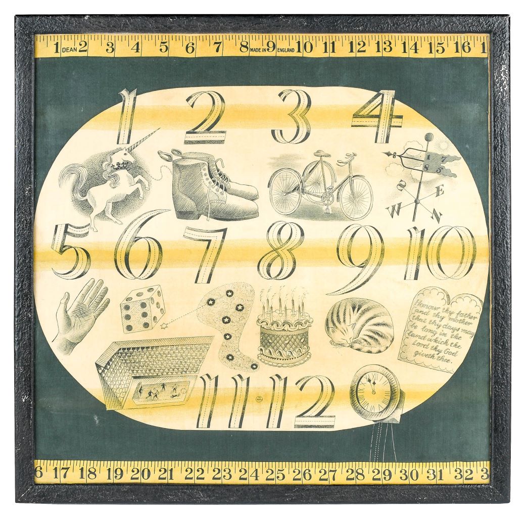 A very rare example of his work is coming up for sale in the 20th Century Design Sale on 5th October – a child’s handkerchief. Ravilious was asked by the British Cotton Board to make some designs for handkerchiefs and scarves, which were to be displayed in travelling exhibitions in the United States featuring work by War Artists. The designs were to be manufactured by a firm in Lancashire which produced textiles printed by lithography, a highly unusual textile printing process, in which Ravilious was increasingly interested. The first experimental textile made was a child’s handkerchief, which was tested by being printed on paper in tonal blues, with working trial patterns in the margins. Ravilious then reworked the design. The final version was simpler and used bright yellows against dark greys and greens, and an example of which is now up for auction. The design combines stylised numbers and images, and between figures eleven and twelve is the inscription ‘To John’, John being the eldest child of the artist and his wife, Tirzah. The handkerchiefs were never commercially produced, and it is thought that there were fewer than five sample handkerchiefs made.