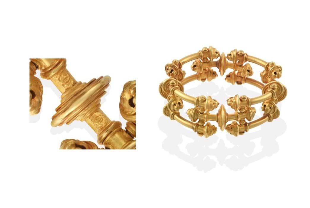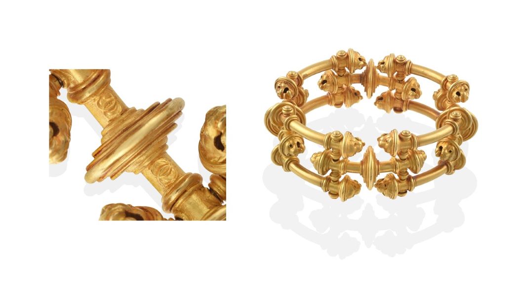 Art Deco pieces continue to generate high levels of interest, and amongst a good selection of such pieces in the sale were an unusual Art Deco Jade, Diamond, Ruby and Onyx Pendant of giardinetto design by Lang, Paris circa 1925, which sold for £6,800, and a Diamond Bow Brooch by LaCloche Freres of the same date, which sold for £2,200. Also of note was an Archaeological Revival Bracelet by Castellani, circa 1860, which sold for £20,000.