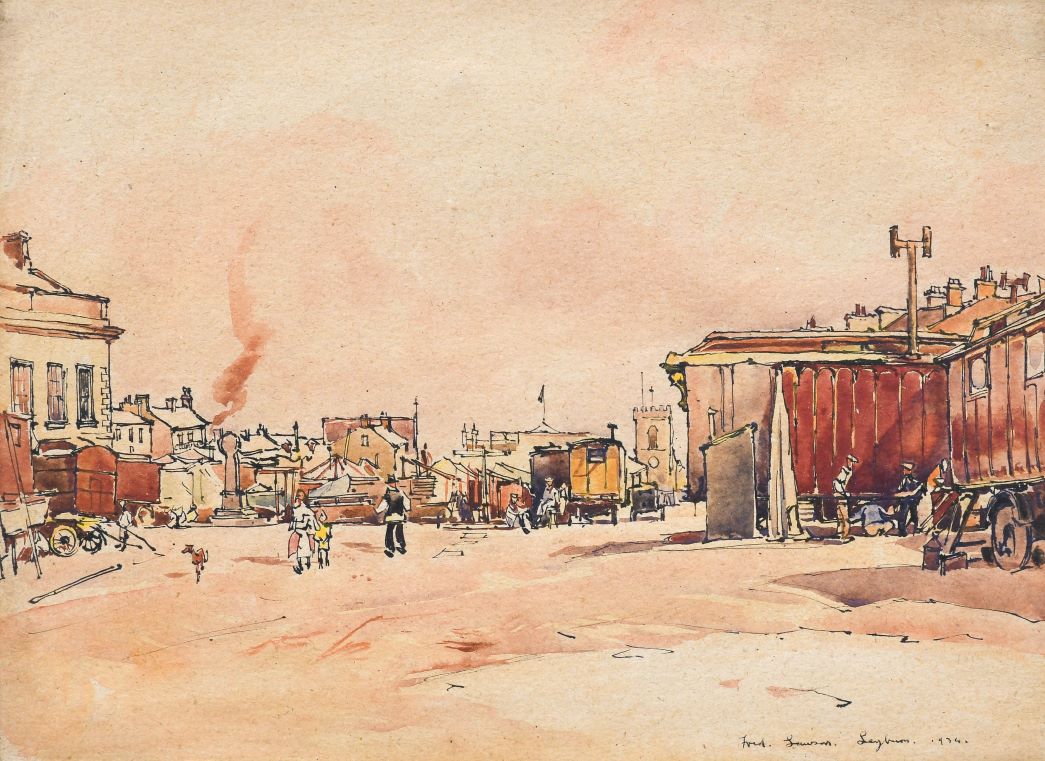 Fred Lawson was born in 1888 to a loom-weaving and mill owning family in Yeadon to the north of Leeds, one of five siblings. Lawson’s father, George, worked in the family woollen mill, and his mother, Emma, hailed from Lincoln (trips to visit his mother’s family in Lincoln are documented in paintings in this exhibition).