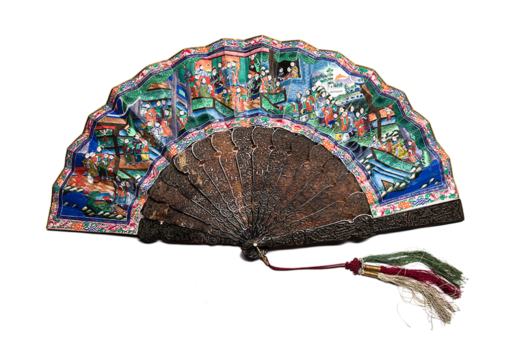 Indeed the top lot of the sale was a Mid-19th Century Chinese Carved Tortoiseshell Mandarin Fan from the Qing Dynasty, an elaborate and beautifully detailed fan and box that sold for £3,700 (plus buyer’s premium). The colorful leaf depicted groups of figures with ivory faces and applied silk robes, and the tortoiseshell sticks were intricately carved with figures in landscapes. Other notable Chinese fans included a circa 1830-40 Chinese Wooden Brisé Fan also from the Qing Dynasty, heavily lacquered in gold, which sold for £2,600 (plus buyer’s premium); a circa 1840-60 Chinese Fan featuring a Far Eastern Harbour Scene also attracted interest to sell for £2,000 (plus buyer’s premium).