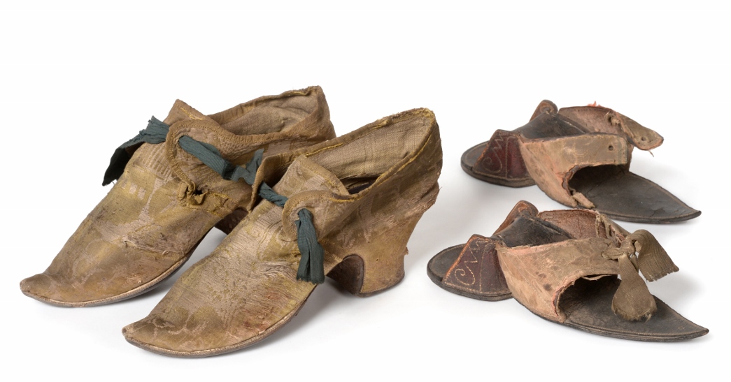 The top lot of the sale was a pair of 18th century gold and green silk brocade shoes – woven with silver thread and sold with a pair of associated 18th century pattens, which sold for £1,900 (plus buyer’s premium). Examples of 17th century needlework were amongst the oldest items in the sale, with two silk stumpwork pictures, a type of three-dimensional raised embroidery selling strongly. The first, selling for £1,100 (plus buyer’s premium), depicted the Five Senses in the guise of five ladies, surrounded by motifs including lions, birds, butterflies, silk and swans. The second, depicting King Charles II and his wife Catherine in a cartouche of woven metallic threads, topped with the initials M and H, and surmounting a leopard chasing a stag was sold for £1,500 (plus buyer’s premium).