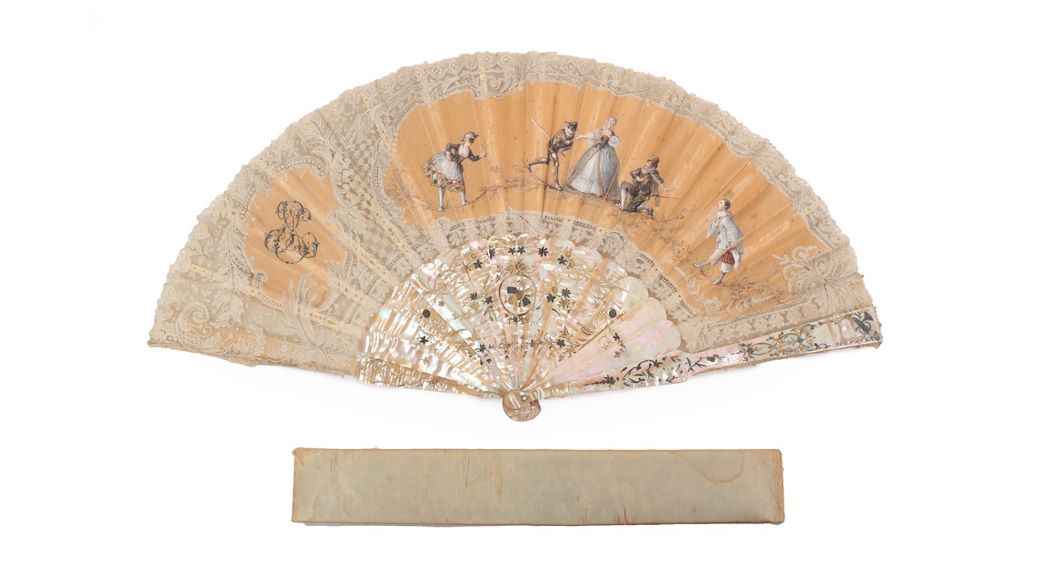 Nearly 400 lots of Fans and Fancies will also be sold at Tennants on 20th November. The sale will feature fans and accessories from a Major European Collection including exquisite 18th century embroidered caps. The fans from this collection, with lace leaves of every variety, are complemented by a Brussels lace fan from another vendor signed by the Parisian fan maker Alexandre, featuring silk panels painted with characters from the Commedia Della Arte (estimate: £750-1,000). Also included in the sale are two fine quality collections from deceased estates. Highlights include a good Chinese Mandarin fan with tortoiseshell monture, and a Chinese carved tortoiseshell brisé. The very feminine fancies will include Mother of Pearl accessories and a large cream Canton shawl embroidered very vibrantly with fans.