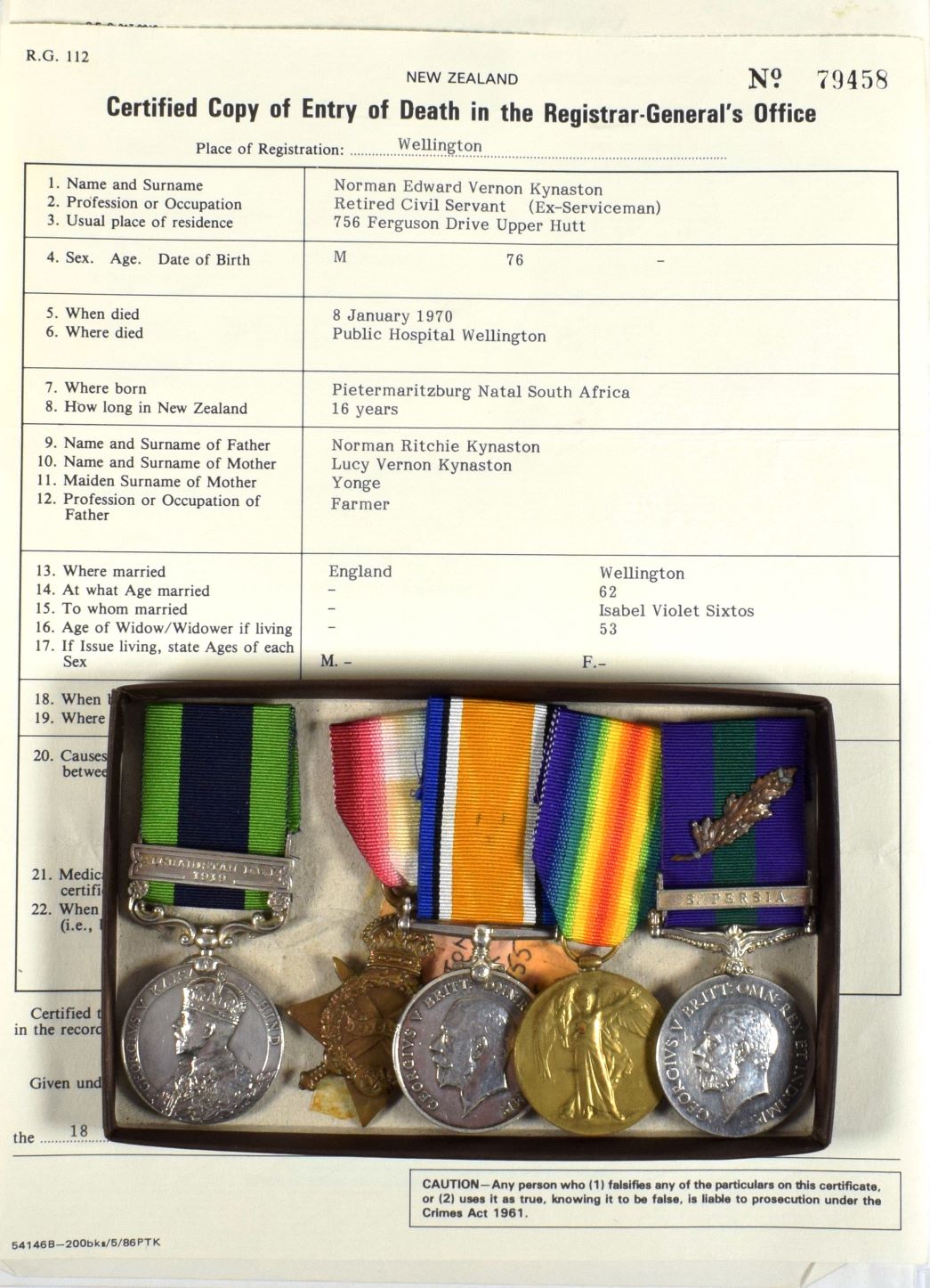 From the same collection came a First World War/North West Frontier Group of Five Medals, awarded to Captain Norman Edward V. Kynaston of the Liverpool Regiment, who served in the Territorial Force, before transferring to the Indian Army and later returned to serve in the Liverpool Regiment. The medals, which comprised a 1914-15 Star, a British War Medal, a Victory Medal, a General Service Medal 1918-62 with MID oak leaf and S. Persia clasp, and an India General Service Medal 1909 with Afghanistan N.W.F. clasp 1919, sold for £2,500 (plus buyer’s premium).