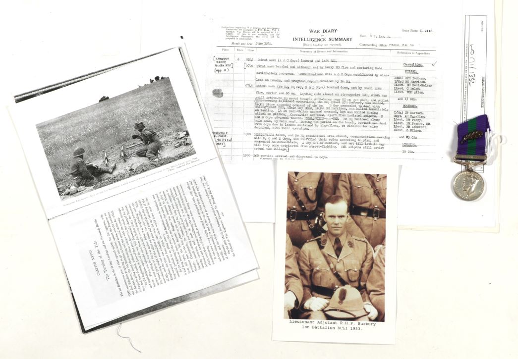 Medals were the order of the day in Tennants Auctioneers’ Militaria & Ethnographica Sale on 5th June, with strong prices seen for lots supported by extra research material. Indeed, one particularly good Private Collection from a deceased estate saw exceptionally high prices, with each lot sold alongside material revealing details about the recipients lives and service records. The top lot of the collection was a General Service Medal 1918-62, awarded to Captain R.P.H. Burbury, D.C.L.I, a D-Day Casualty, which sold for £3,200 (plus buyer’s premium). With a Palestine clasp and MID oakleaf, the medal was sold alongside a copy of the War Diary for June 1944 noting Burbury’s death, a map and photographs. Richard Burbury was born in Barnsley and was commissioned with the Duke of Cornwall’s Light Infantry as 2nd Lieutenant in 1925. He was commanding the 1/South Lancashire Regiment as Lt. Colonel on the D-Day landing of 6th June 1944 when he was killed in action.