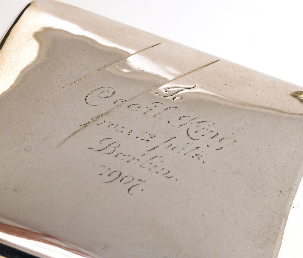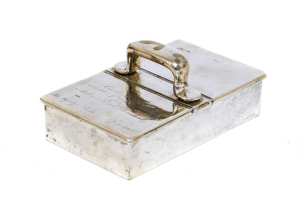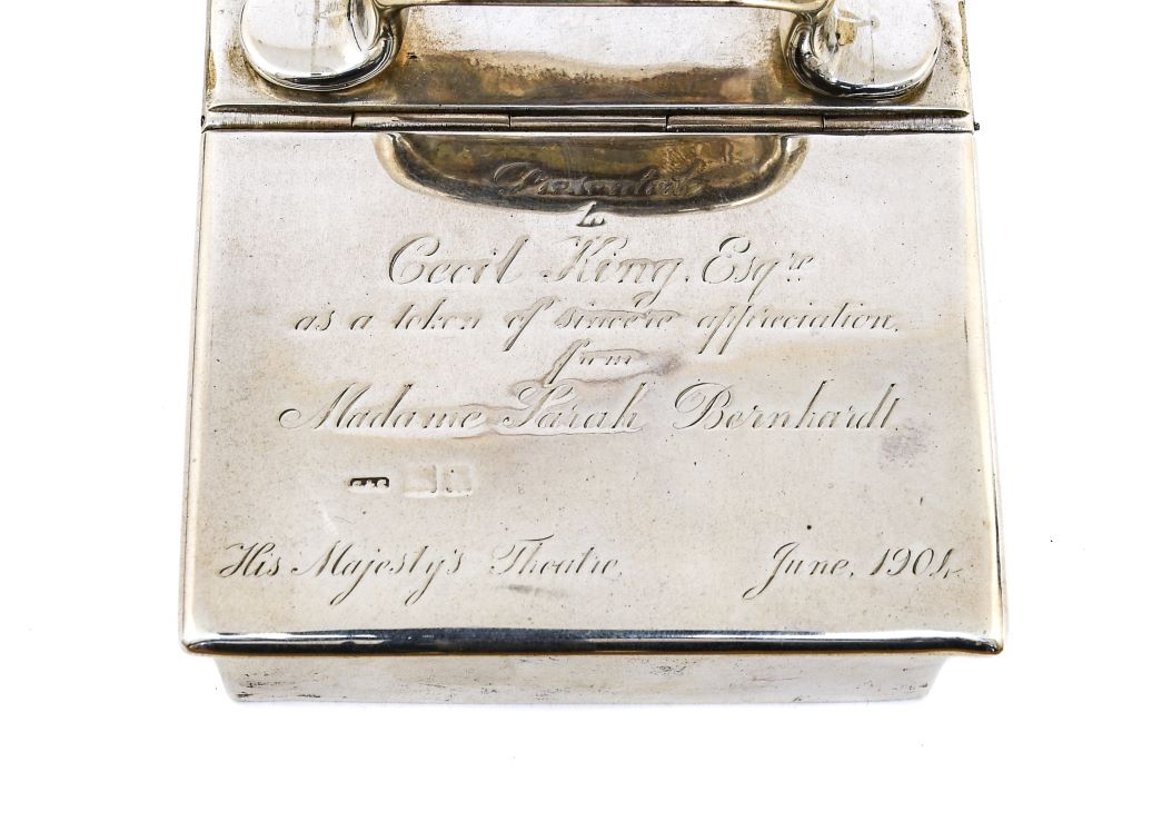 The first is an Edward VII Silver Double Cigarette Case, made by Cohen and Charles of London in 1904 and engraved ‘Presented to Cecil King, Esq’re as a Token of Sincere Appreciation from Madame Sarah Bernhardt His Majesty’s Theatre June 1904’ (estimate: £150-250 plus buyer’s premium). Sarah Bernhardt (1844-1923) was the leading French stage actress of the late 19th and early 20th century, and one of the first prominent actresses to make sound recordings and act in motion pictures. Born in Paris the illegitimate daughter of a courtesan to the upper classes, Bernhardt would develop a cult-like following. Still a well-remembered name today, she was famed for her dramatic death scenes and for occasionally sleeping in a coffin.