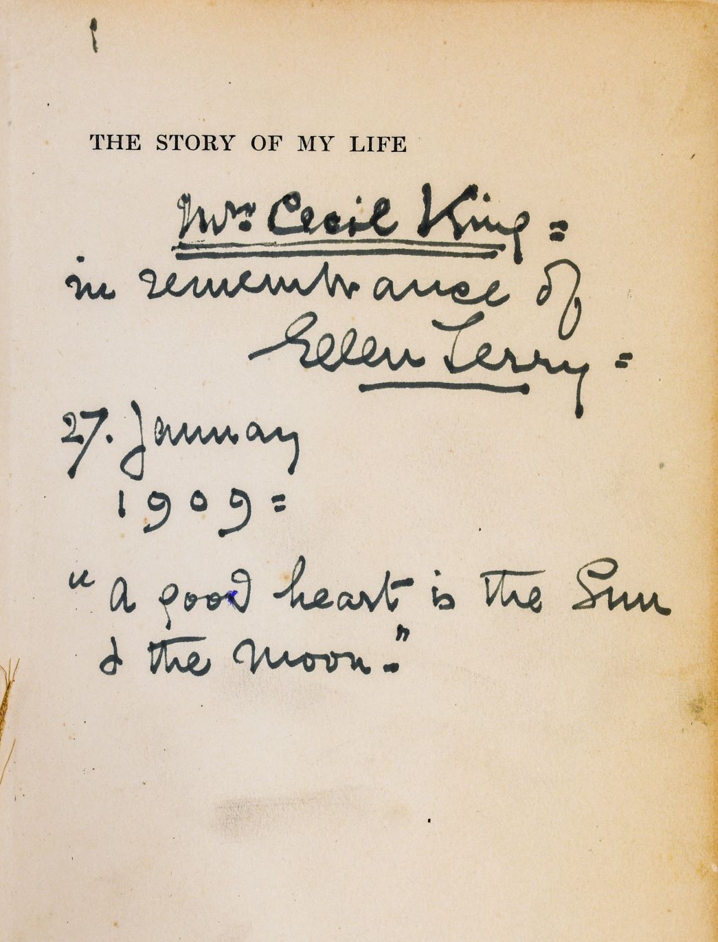 Also on offer is a lot offered with an estimate of £200-300 comprising an Edward VII Silver Salver by Thomas Bradbury & Sons, London 1905, inscribed ‘From Ellen Terry to Cecil King 1906’, an Edward VII Silver Cigarette Box by Sampson Mordan and Co., London, 1904, inscribed ‘To Cecil King From 12 Pals Berlin 1907’, and a signed copy of Terry’s autobiography. Dame Alice Ellen Terry (1847-1928) was born into a family of actors. Her career began in childhood, performing Shakespeare in London. After a brief hiatus during an ill-fated marriage at 16 to the much older artist George Frederick Watts, Terry became the leading British actress of the era.