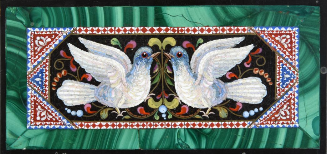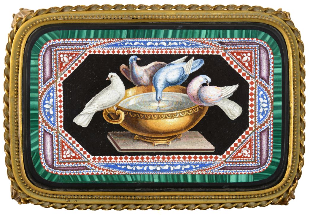 A particularly fine example is coming up in the Summer Fine Sale on 16th July – an Italian Gilt Metal and Micromosaic Casket made in Rome circa 1860. The casket has beautifully wrought peacocks and doves on the four side panels, but the central focus is the lid with its fine depiction of the Doves of Pliny or the Capitoline Doves, one of the most important mosaic motifs. The image of four doves around a water vessel was taken from a 2nd century A.D. mosaic, discovered in the 1730s at Hadrian’s Villa in Tivoli and transferred to the Capitoline Museum in the 1760s. At first believed to be a mosaic described by Pliny, it was actually made after the philosopher’s death and is now thought to have been based on an Ancient Greek mosaic by Sosus of Pergamon. The casket, which is also set with green malachite, is a rare and fine object and exemplifies the art of the micromosaic.