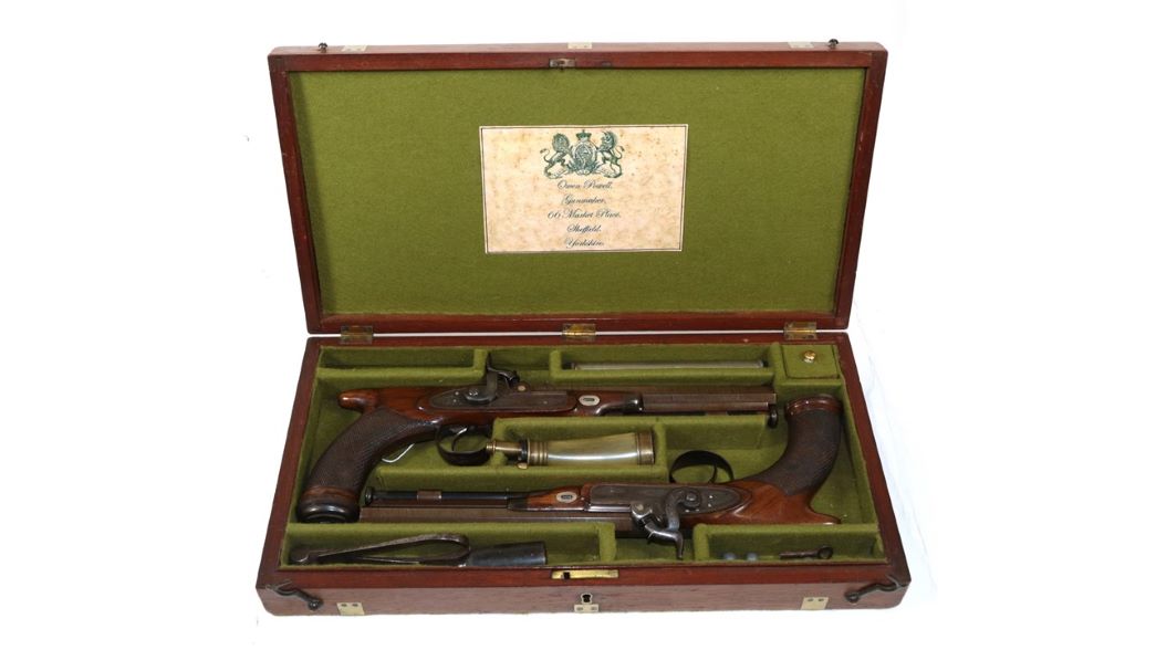 Further highlights amongst the arms and armour in the sale included a Japanese Shinto Wakizashi, which sold for £1,100, and a late 18th century Qajar Steel Shield sold well, too, at £900. A good pair of 19th century Saw Handled Percussion Duelling or Officer’s Pistols by Owen Powell of Sheffield sold for £4,0000, and a good pair of 19th century Flintlock ‘Man-Stopper’ 15 Bore Travelling Pistols by W & J Rigby of Dublin sold for £5,400.