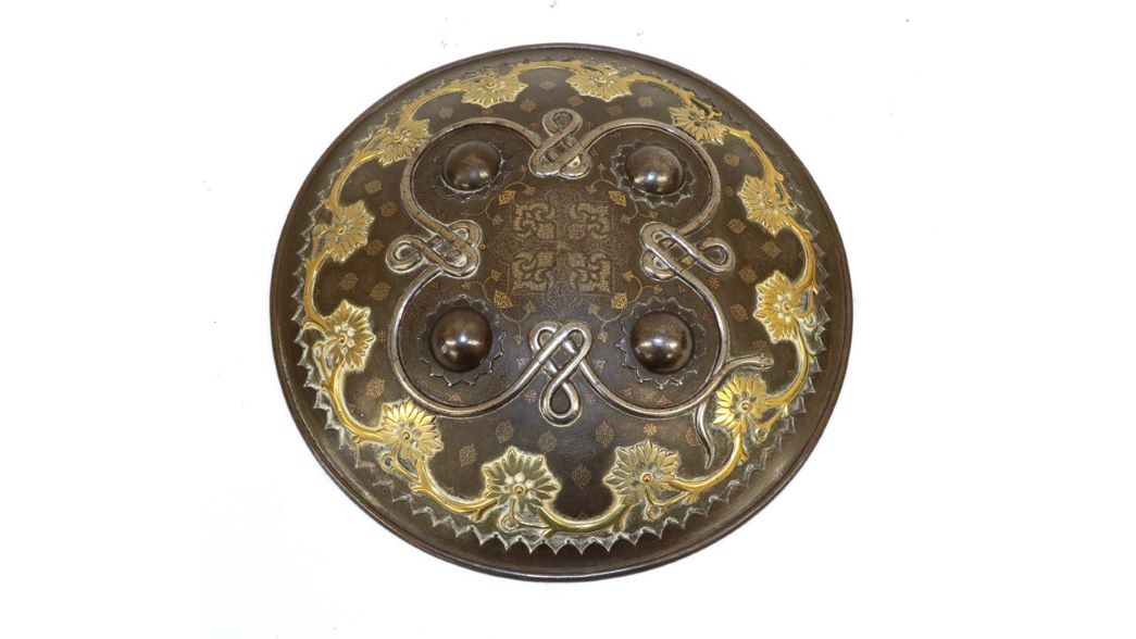 Finally, a 19th Century Indo-Persian Steel Shield sold well above estimate at £500. The convex circular shield was highly decorated with applied brass flowerheads and tendrils, and applied steel quatrefoil entwined serpent and gold koftgari decoration.