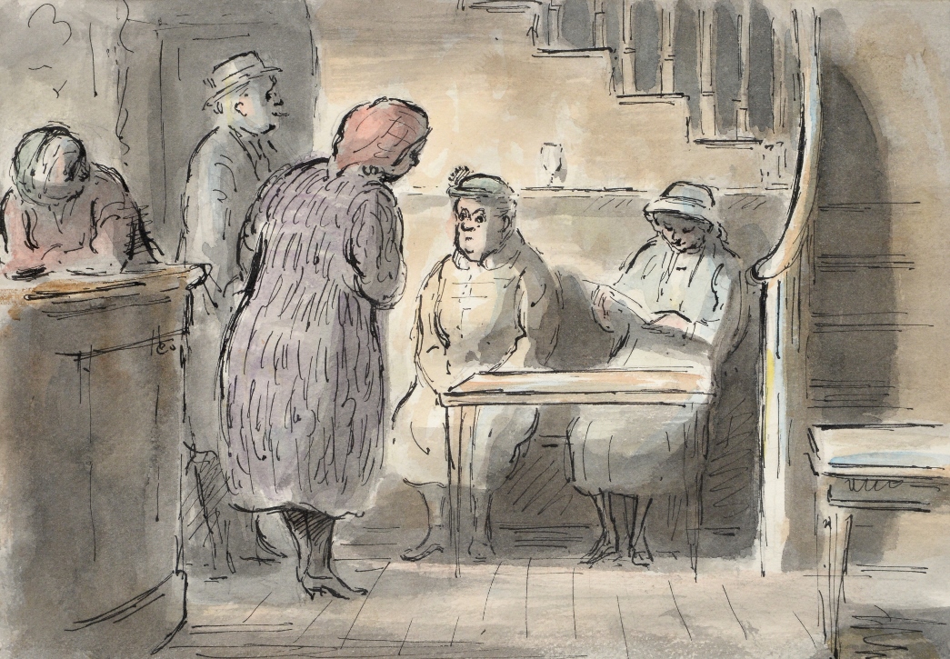 His work is warm, witty and based on observations of the everyday life that surrounded him. Indeed, even his war work was praised for showing a more human side to war; he captured scenes of quiet heroics, of coping with everyday life in wartime. Ardizzone populated his pictures with instantly recognisable and relatable figures, and he had a keen eye for human interactions which he translated to paper with great humour.