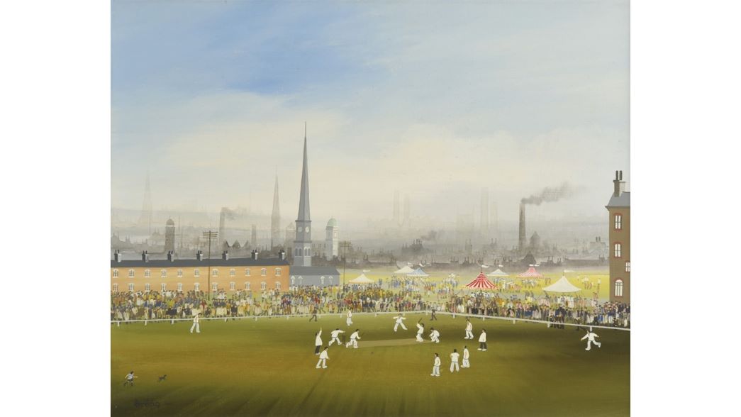 Northern Art sold strongly throughout the sale, topped by ‘Come Back’ by Brian ‘Braaq’ Shields. Depicting the moment a young boy, representing ‘Braaq’, runs across a cricket match set against a brooding industrial city-scape, the painting sold for £15,000. By the same artist and selling well at £7,500 against an estimate of £3,000-5,000 was a pair of pencil drawings ‘Young Boy with a Dog’ (self-portrait as a boy) and ‘Young Boy and Girl’ (self-portrait as a boy with his sister?). Further paintings of note included Mary Fedden’s ‘"Fruit", Still Life with Grapes, Pears and Cherries’ that sold for £7,500, and David Shepherd’s ‘Cool Tiger’ that also sold for £7,500.