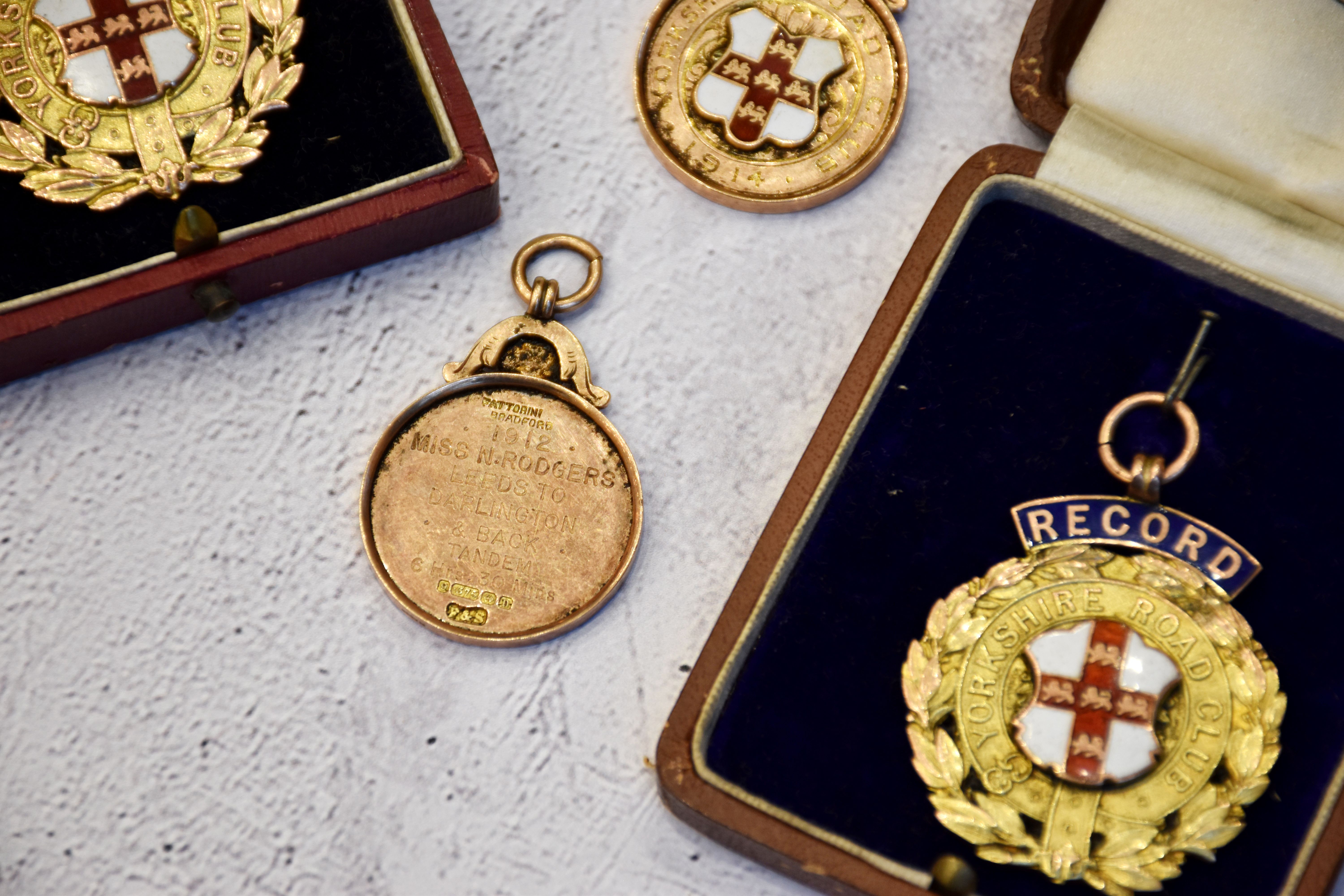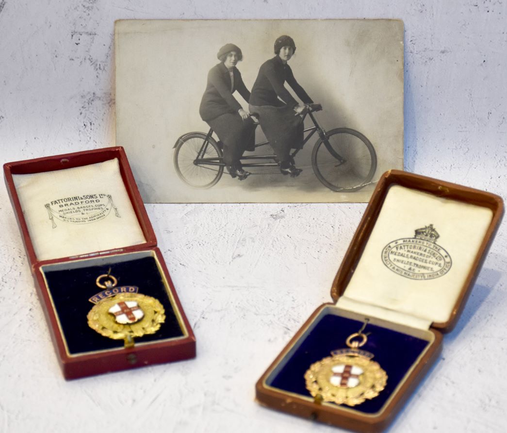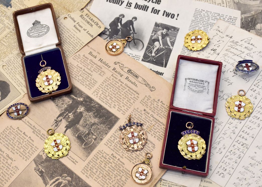 The collection is estimated at £2,000-3,000 (excluding buyer’s premium) and includes notable medals such as the Yorkshire Road Club Record gold medal inscribed "Miss N Rodgers 359 miles 24 hours Tandem (unpaced) 1910", two Yorkshire Road Club "Life Member" badges, and two files of assorted newspaper cuttings and other paperwork relating to the Rodgers' exploits including the Yorkshire Road Club Rules 1909.