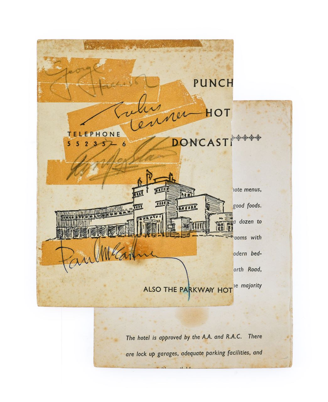 The top lot of the whole sale was a set of four autographs by The Beatles, which sold for £2,800 against an estimate of £1000-1,500. The signatures were obtained at Punch’s Hotel, Doncaster, where the group were staying. Ringo had a sore throat, and was visited by Dr Grafdyke, who refused payment but accepted the autographs on a card from the hotel; he later gave them to the daughter of his neighbour, who was the vendor.